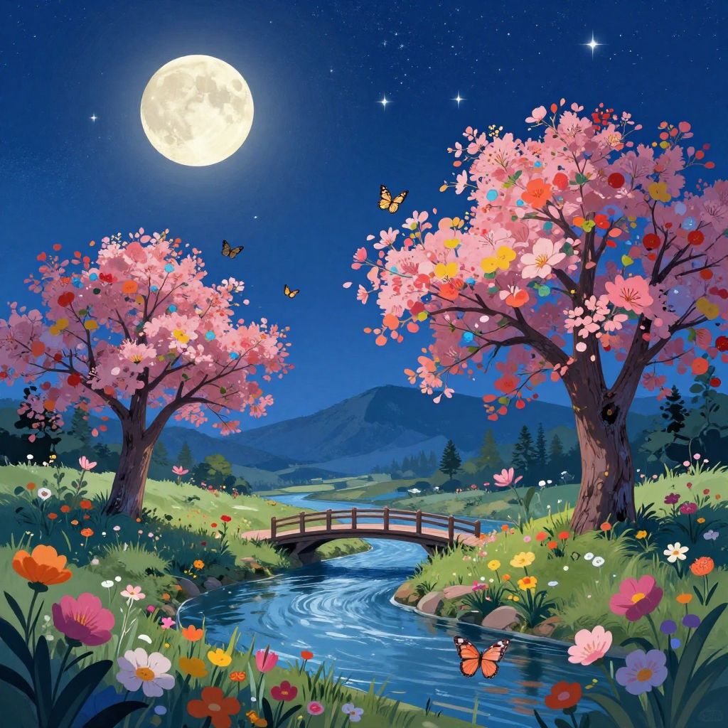Digital illustration of a moonlit forest night, featuring a winding river, silhouetted trees, and a large, bright full moon behind a we