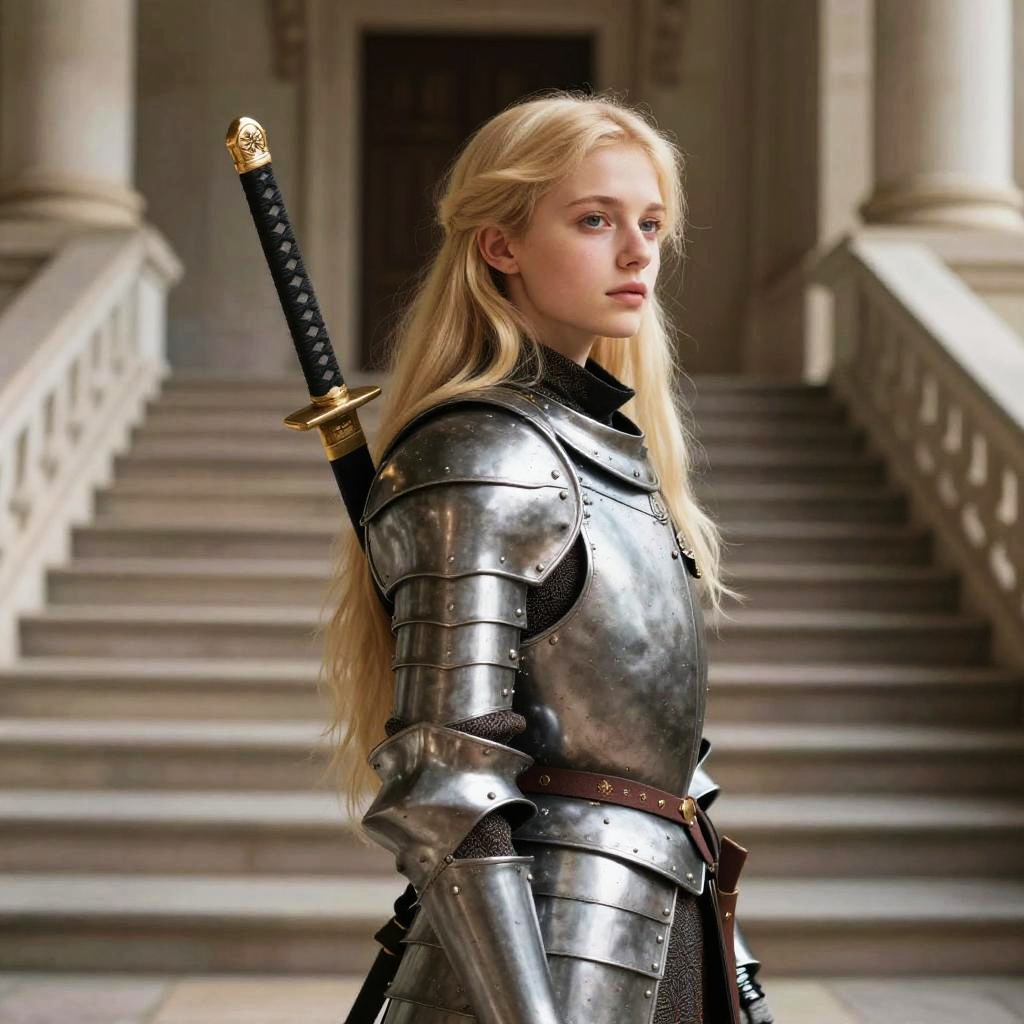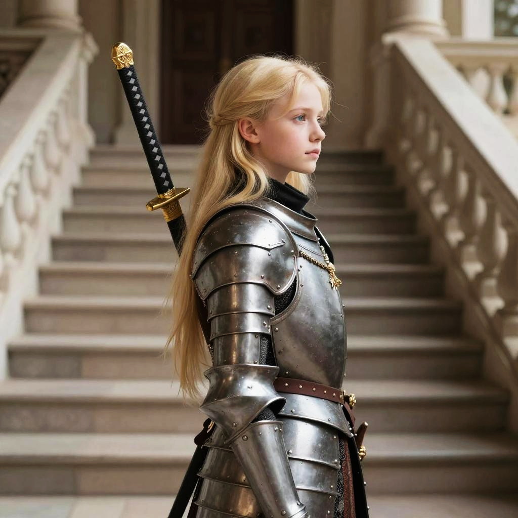 Realistic photo.Evolution small chin, white transparent skin, a beautiful girl with blonde hair, baby face, she is young, narrow face, she wears a medieval European light armor, Japanese sword on her back, long straight hair, staircase of the palace, photorealistic, realistic photo, 8k, side profile realistic photo