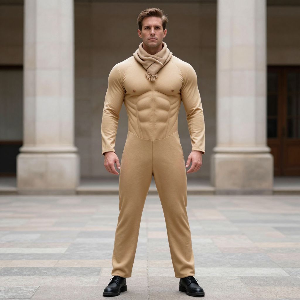 Muscle Torso Costume, man in a scarf and pants standing in front of a building