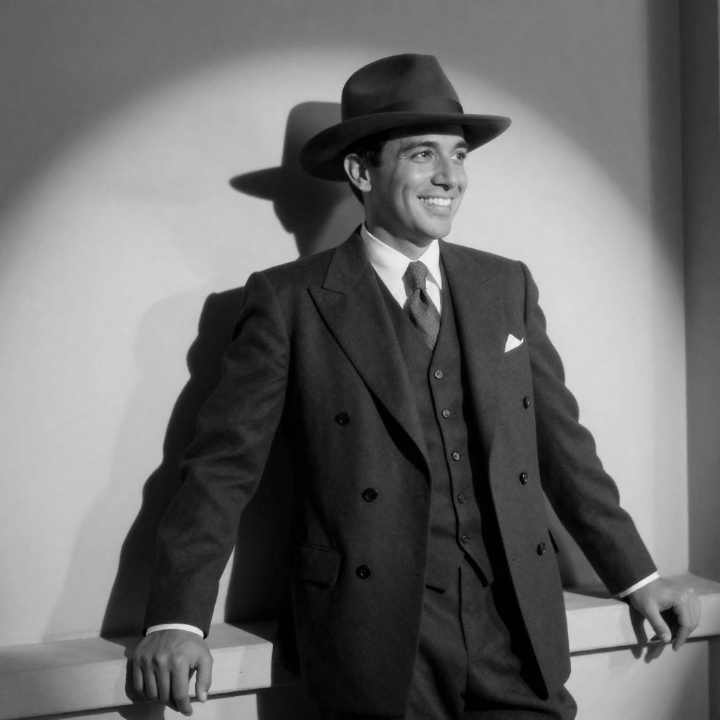 Black-and-white photograph of a serious-looking man with dark hair, wearing a fedora and suit with a tie, standing outdoors. Background includes blurred trees and a building. Man is centered, facing left. Blurred, overcast sky.