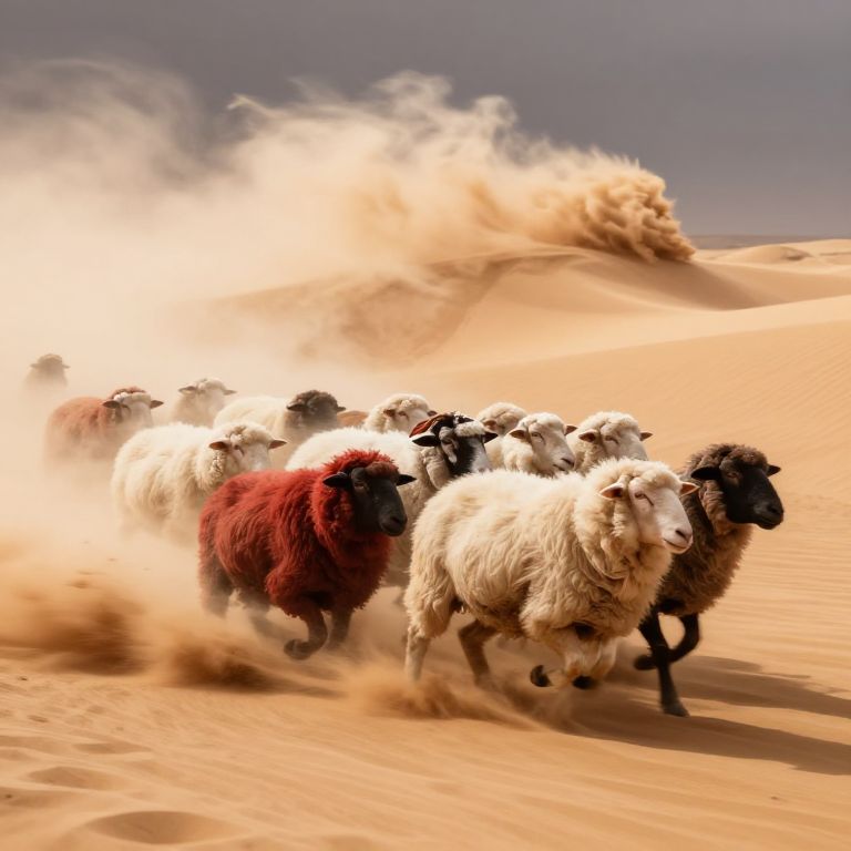 Photograph of a flock of sheep racing through a sandy desert. The sheep, with varying wool colors including white, black, and red, create a cloud of dust as they move swiftly from the foreground to the background. The red sheep is prominently visible in the center. The desert sand is a golden hue with rippled textures, and the sky above is a muted gray, suggesting a stormy backdrop. The sheep's wool appears thick and fluffy, contrasting with the smooth, flowing sand. The image captures dynamic motion and the harsh beauty of the desert landscape.