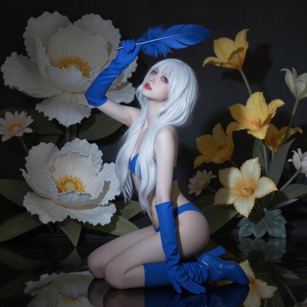 Digital artwork of a white-haired woman in a blue and gold crown, black gloves, and white lace lingerie, lying on her back with legs spread. She has red lipstick and blue high heels, surrounded by a blue, icy background. Her expression is seductive.