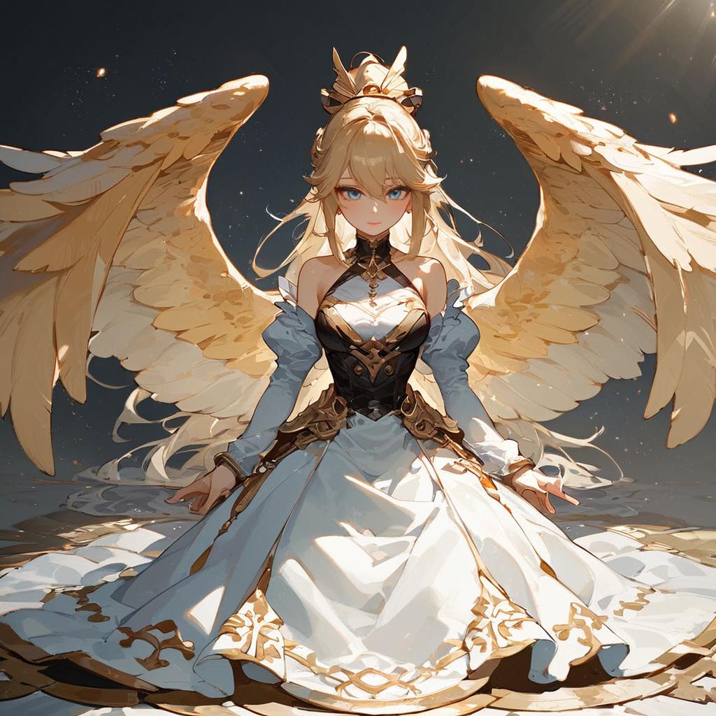Masterpiece, (best quality:1.4), 1girl, large breasts, angel, angel wings, (daytime sky), shimmering aura, intense focus, crackling energy, mysterious symbols, sparkling motes