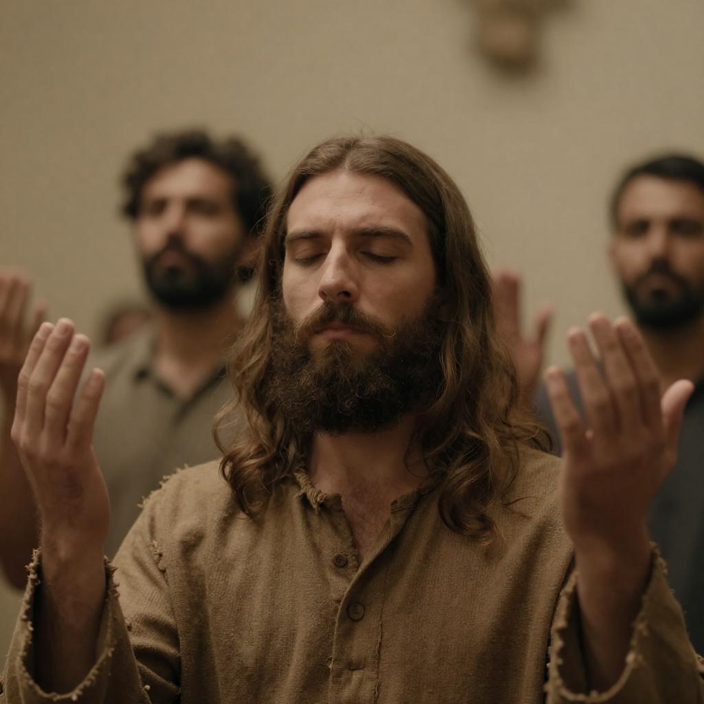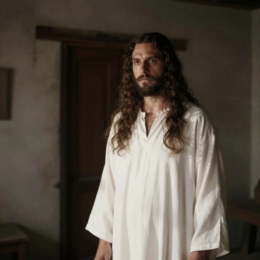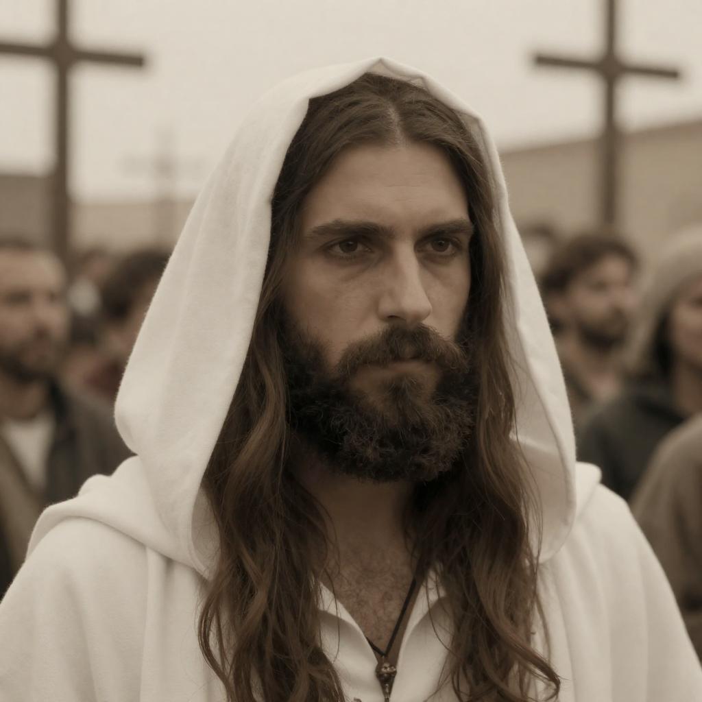 Photograph of a bearded man with long brown hair, wearing a white hooded garment, intense gaze. Background includes a crowd, crosses, and blurred figures. Man's face centered, crowd to the right. Warm, sepia-toned color palette.