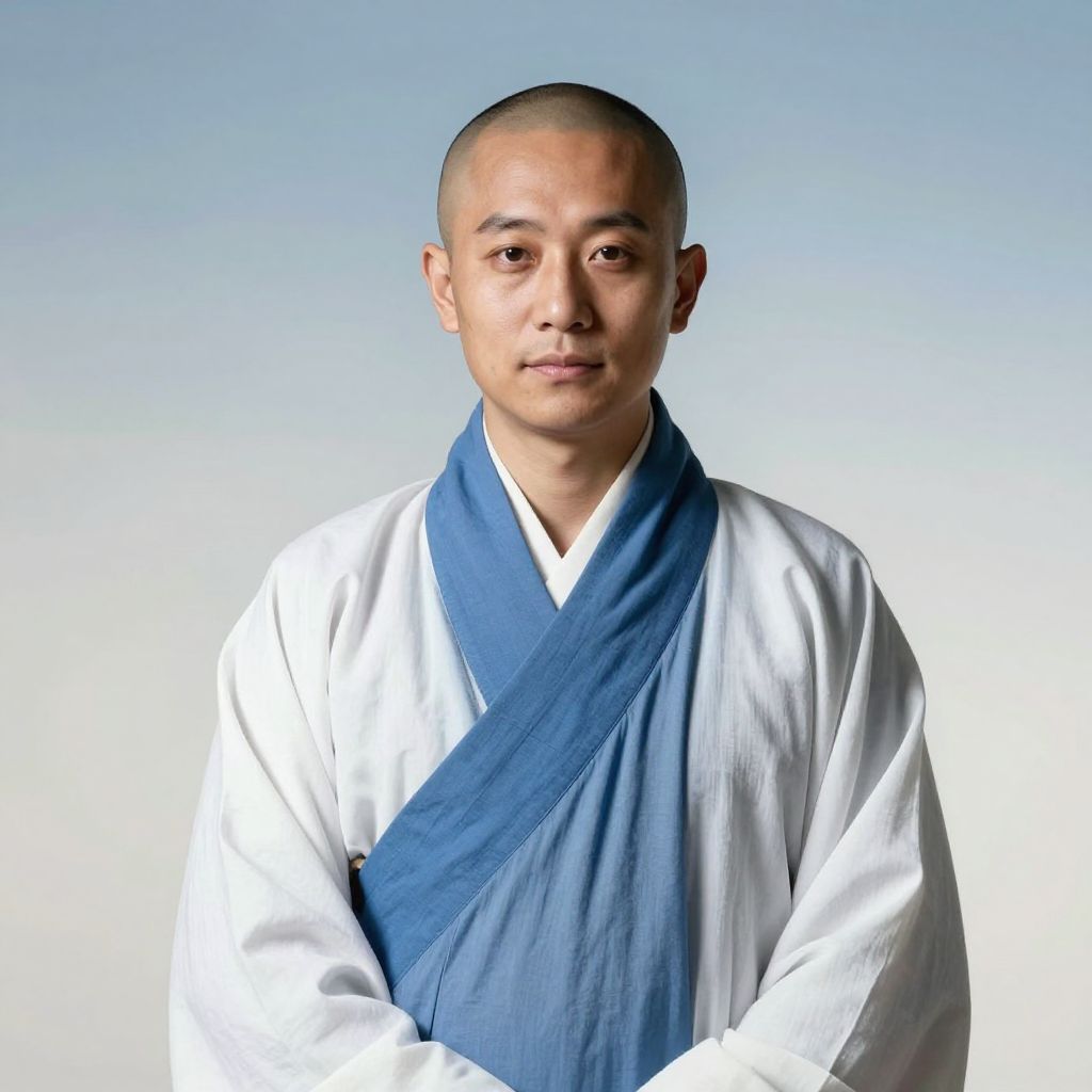 Portrait of a humble monk with a shaved head and average build, dressed in a modest, simple robe with a blue inner garment and white outer robe. The monk stands against a fading blue to white studio background with diffused natural light highlighting the serene and calm expression.