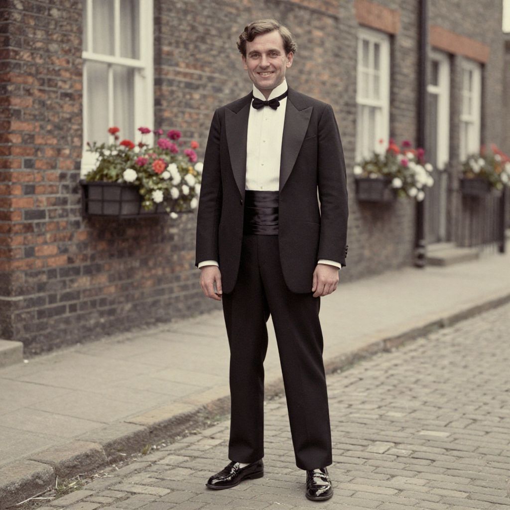 A man, classic black dinner jacket, ivory dress shirt, black satin cummerbund, patent leather loafers, charming brick townhouses, cobblestone streets, blooming flower boxes, hand-tinted photograph, confident smile. Man has masculine face and piercing eyes