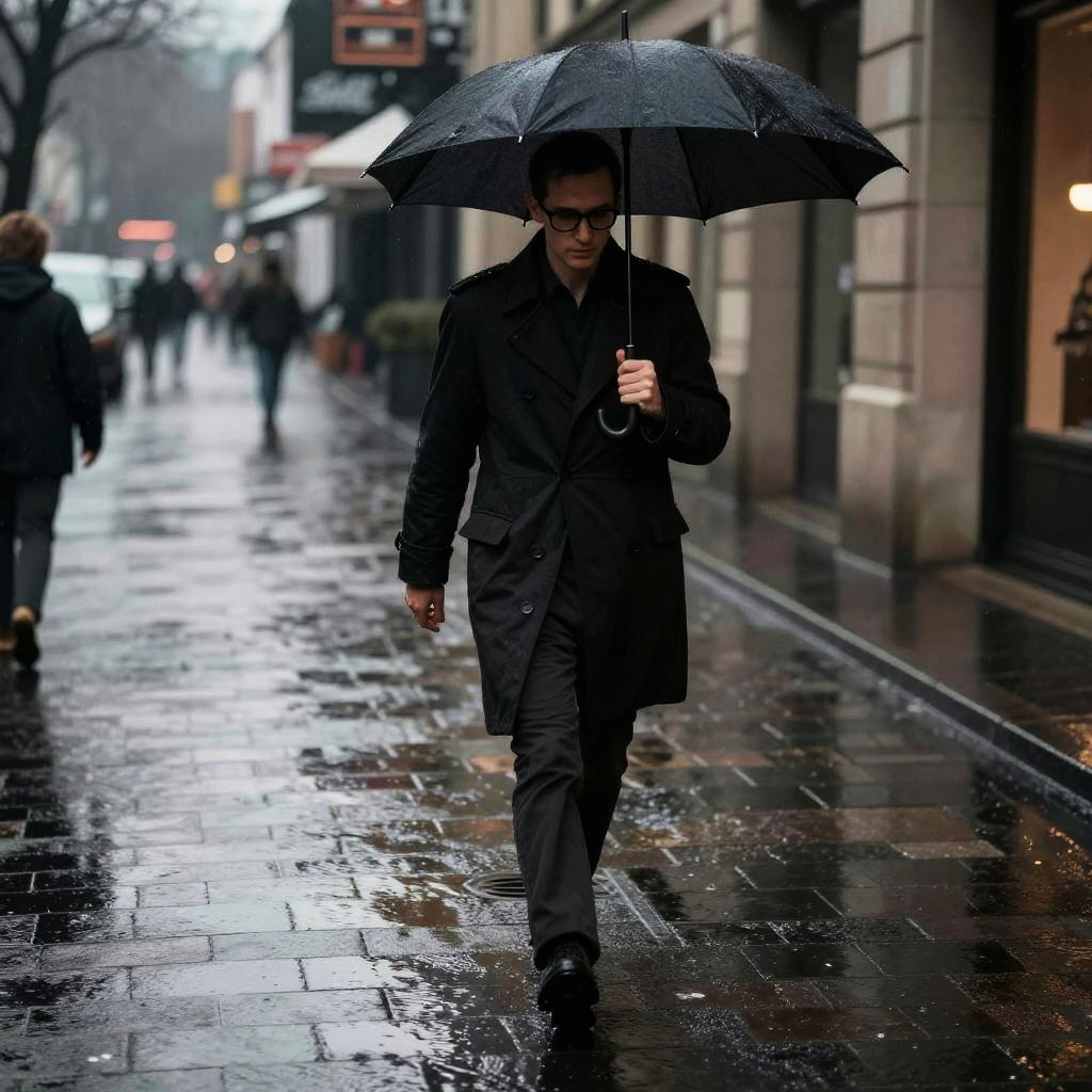 Character with black glasses walking through a rainy street, umbrella in hand, reflections on wet pavement, moody and dramatic ambiance, high contrast and intricate patterns.