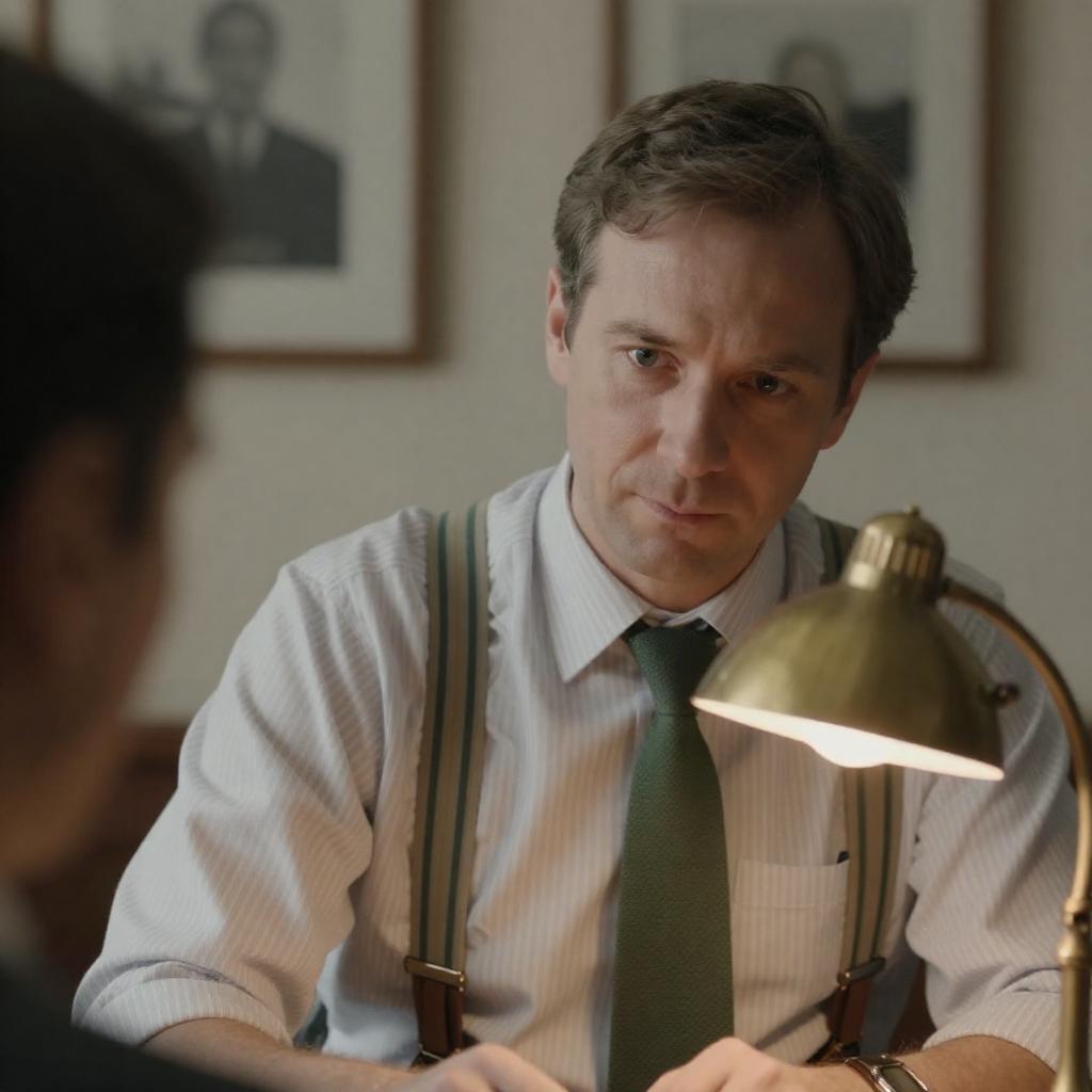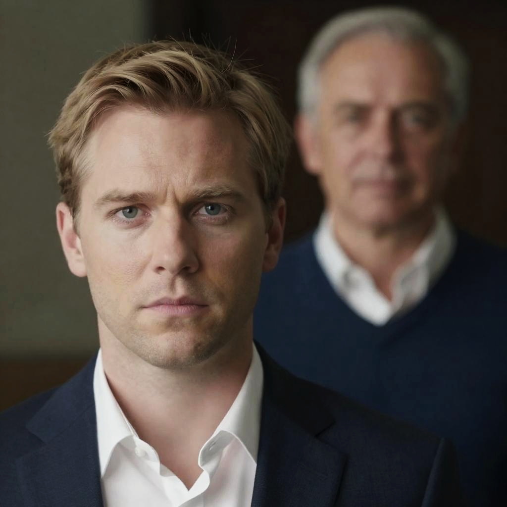 Photograph of a man with light brown hair, blue eyes, and a slight smile. He wears a brown suit, white shirt, and red tie. Background includes office furniture, filing cabinet, blinds, and blurred figure in the distance. Indoor office setting.