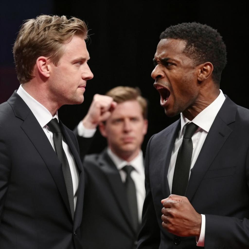 Three men in dark suits with white shirts and black ties engaged in a tense confrontation. The man on the right, with a medium-dark complexion and short curly hair, is shouting angrily with an open mouth and clenched fist. The man on the left, with a lighter complexion and blond hair, listens intently. A third man in the background, also with light complexion and blond hair, raises his fist. The scene is set against a dark background.