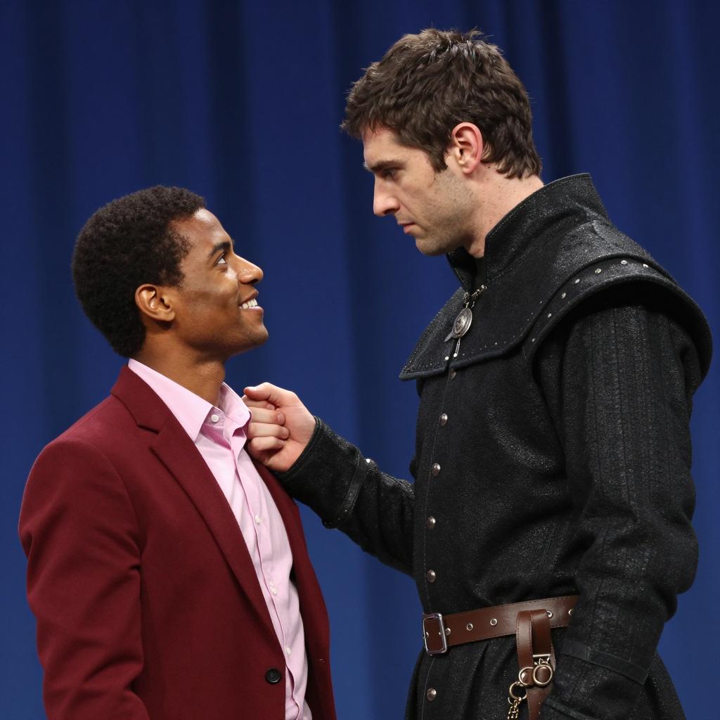 Three men in dark suits with white shirts and black ties. The man on the right, with a medium-dark complexion, is shouting with his mouth open and clenched fist. The man on the left, with a lighter complexion, listens intently. A smaller man in the background with a lighter complexion raises his fist. Dark background.