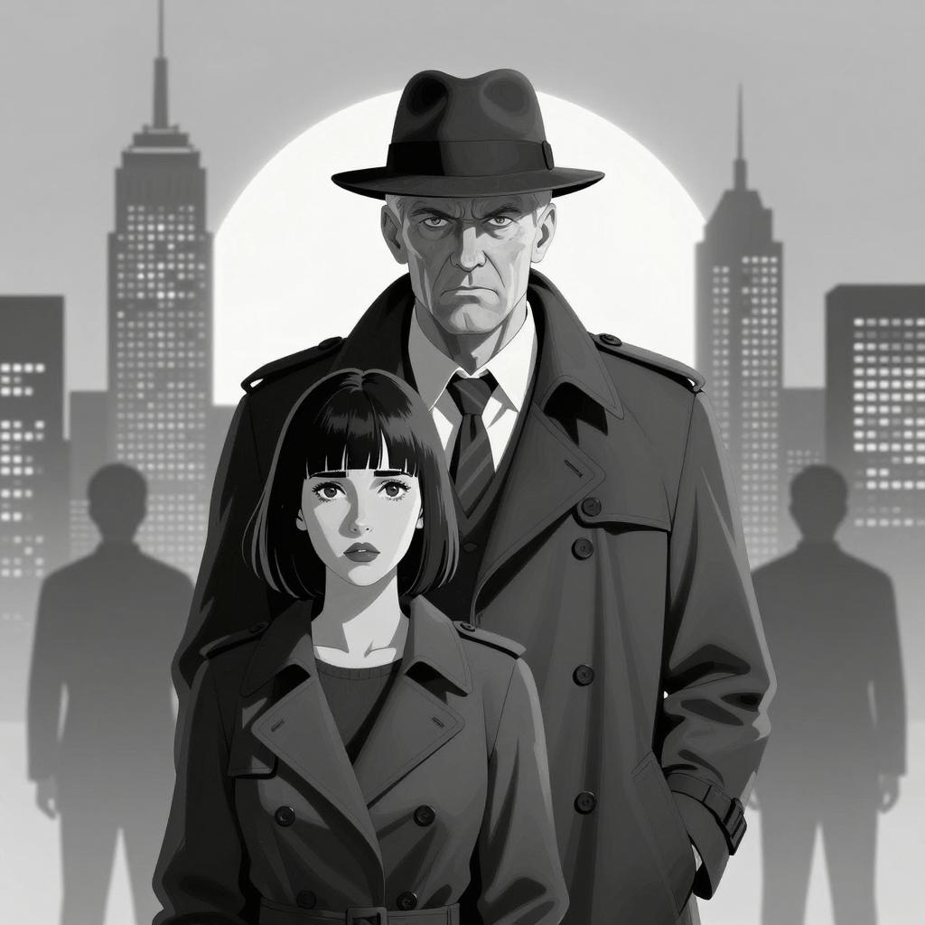 Illustration of a serious older man in a fedora and trench coat standing in front of a determined woman with bangs, both against a grayscale cityscape background with skyscrapers and a circular light pattern in the sky. The man has a stern expression, the woman looks concerned. The cityscape includes tall buildings and illuminated windows. Two people.