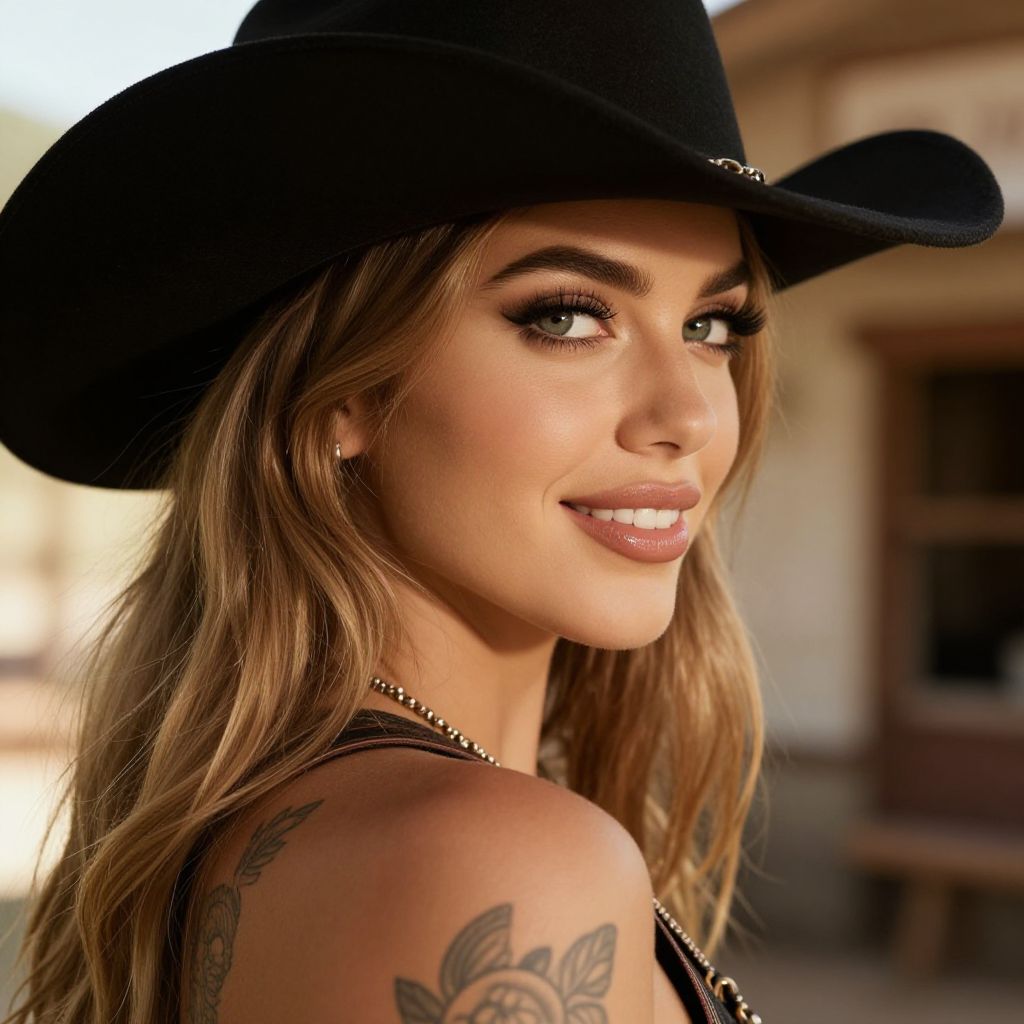 Elaborate beautiful woman, vacation, saloon, high detail, tattoos, cowboy hat, 4k, perfect eyes, glossy eyes, smile, side profile, upper body,
