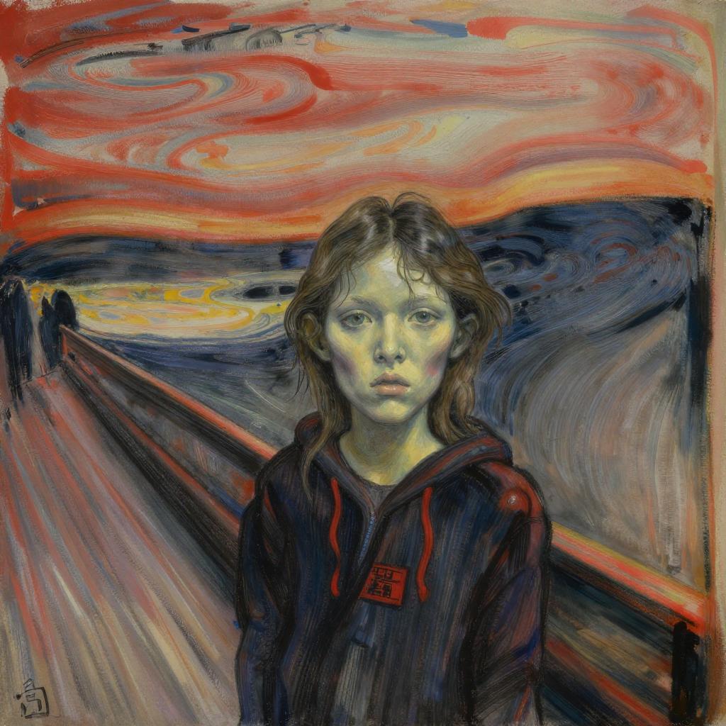 A surreal textured portrait of a teenage girl with a porcelain complexion and neutral expression. She has a swirling hairdo resembling a stormy sky, set against a dramatic red, black, and white abstract background. The girl wears a dark hoodie with red drawstrings and a graphic patch on the chest. The artistic style combines charcoal line sketches with expressive brush strokes, evoking an Edvard Munch inspired visual.