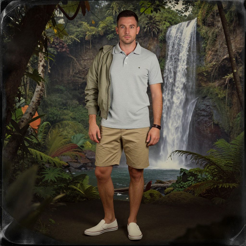 Photograph of a muscular, light-skinned man with short dark hair and a trimmed beard, standing in a lush, tropical forest. He wears a light blue polo shirt, beige shorts, white sneakers, and a green jacket draped over his shoulders. His right wrist has a black watch. Behind him, a cascading waterfall flows into a pool surrounded by dense greenery and ferns. The image has a slight vignette effect, with dark borders framing the scene. The man stands confidently with a neutral expression, hands by his sides.