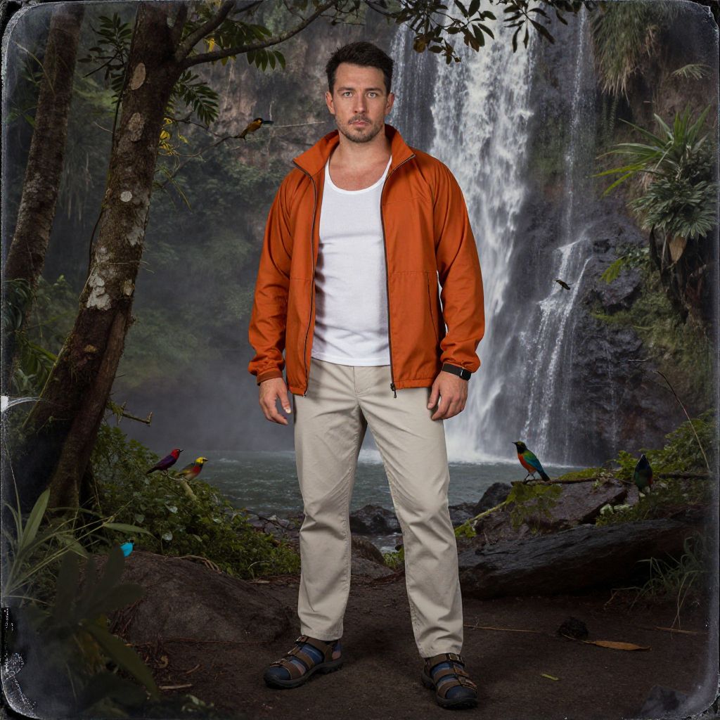 A man, light grey cotton pique polo, slim-fit khaki shorts, slip-on canvas shoes, lightweight bomber jacket, leather bracelet, tropical rainforest exhibit, vibrant foliage, cascading waterfall, collodion wet plate style, relaxed expression. Man has masculine face and piercing eyes