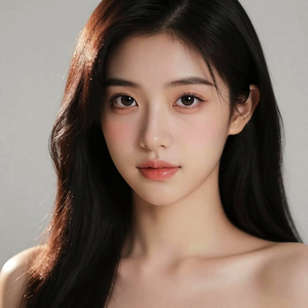 Portrait of a young East Asian woman with long, wavy purple hair wearing a white off-shoulder dress with ruffled sleeves. She is accessorized with elegant drop earrings and poses gracefully against a softly blurred, colorful background.