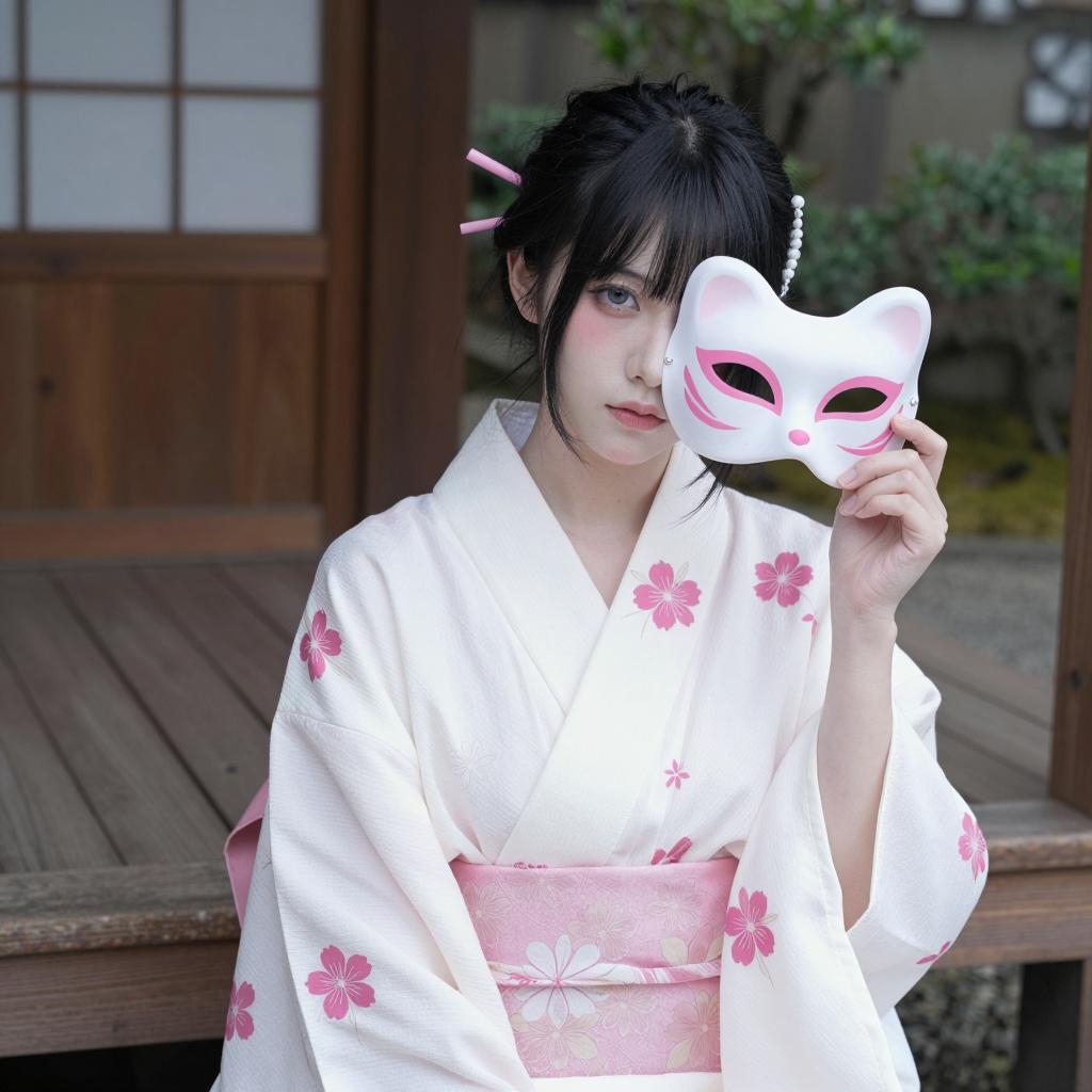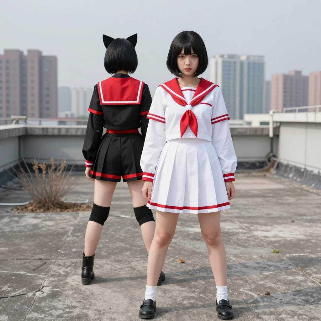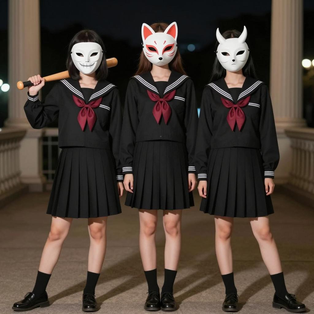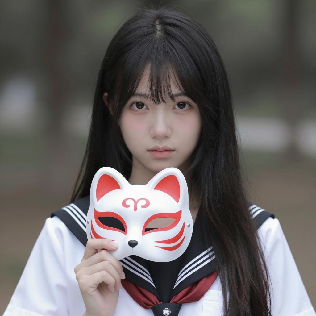 Asian woman with short black hair, wearing a black sailor school uniform, red bow, black pleated skirt, black thigh-high socks, and black shoes. She holds a white fox mask over her face. Standing in front of an old, weathered train station with greenery and graffiti. Train station door open, sign reading "CKS JAPAN." Midday light.