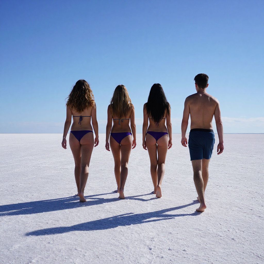 Four individuals walk barefoot along a salt flat path under a clear blue sky, with three trailing behind the lead woman wearing a gray bikini top and purple bottoms, casting distinct shadows on the reflective surface.