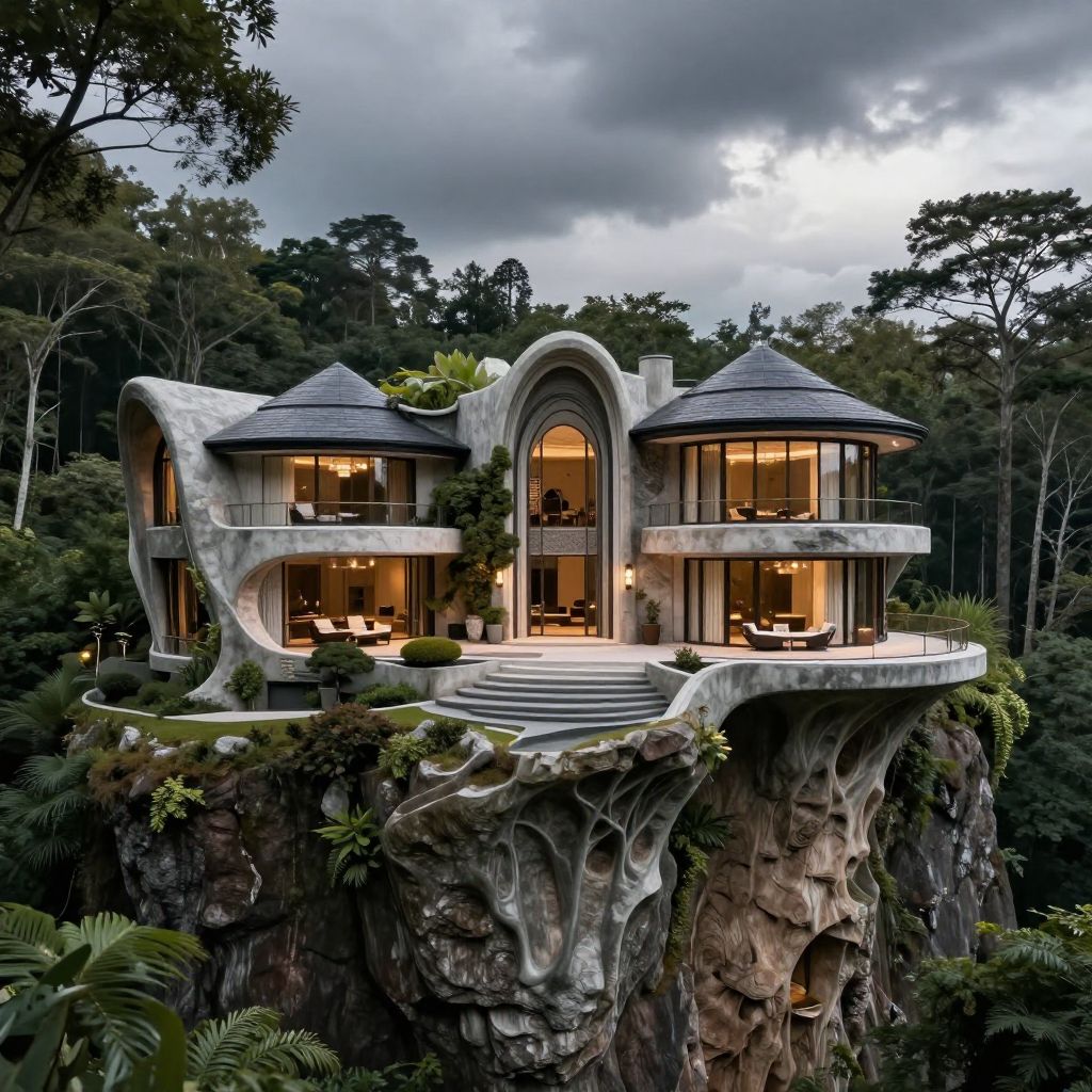AI generated mansion, grand luxury villa perched on a cliff, surrounded by dense forest, seamless integration of organic shapes and advanced tech, dramatic sky, detailed textures, cinematic atmosphere, ultra-realistic rendering