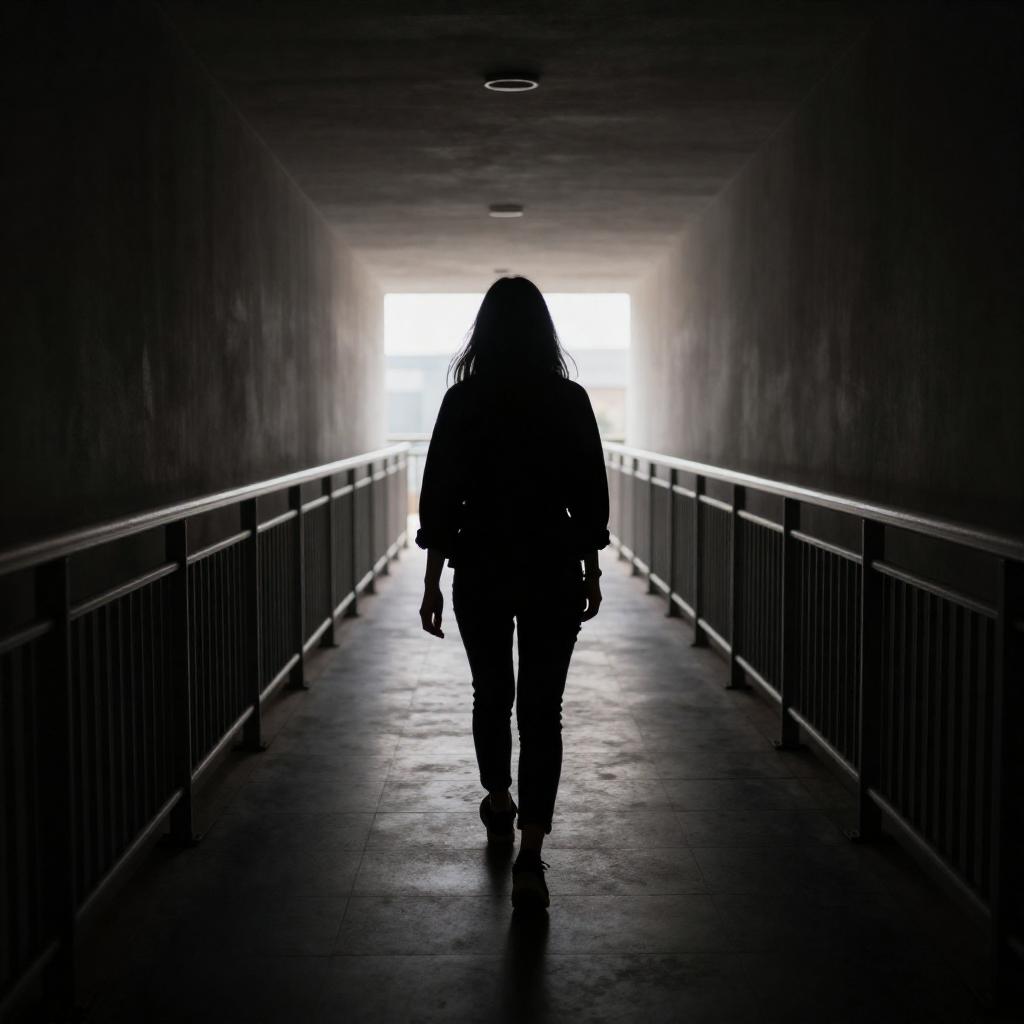 Silhouetted person with long hair, wearing dark clothing, walks down a long, dark, illuminated hallway with metal railings on both sides. Bright light at the end. Corridor extends into the distance. Person's back facing camera.