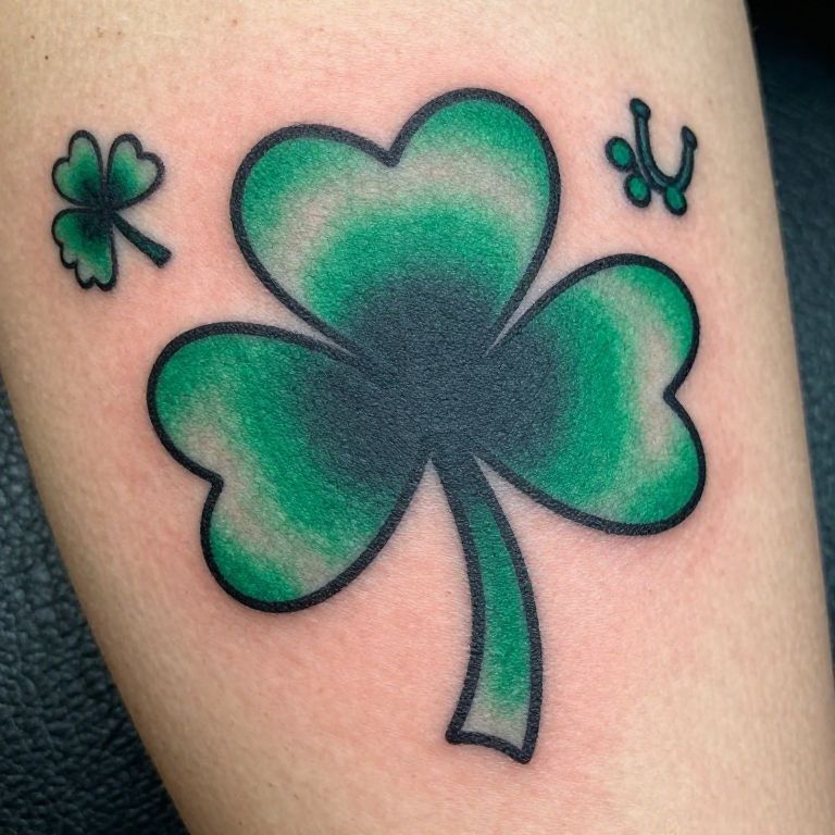A traditional clover tattoo illustrated on realistic textured skin, bold black outlines, emerald green color gradients, combined with small symbolic elements like horseshoes or four leaf clovers, in vintage tattoo artistry style.
