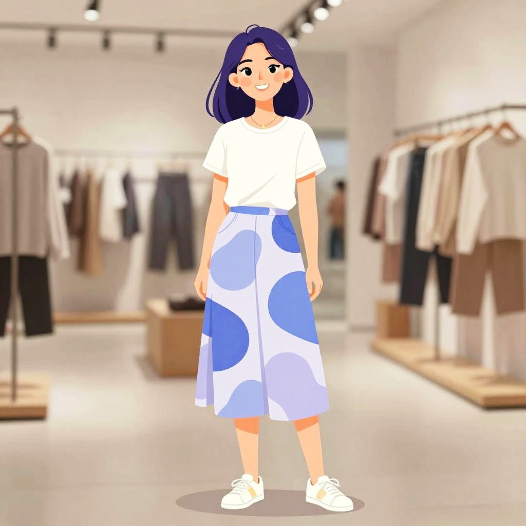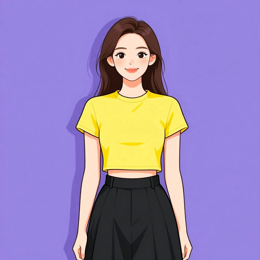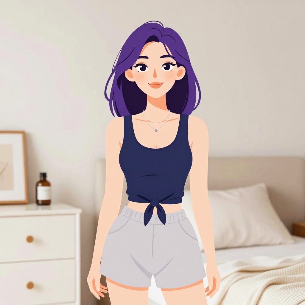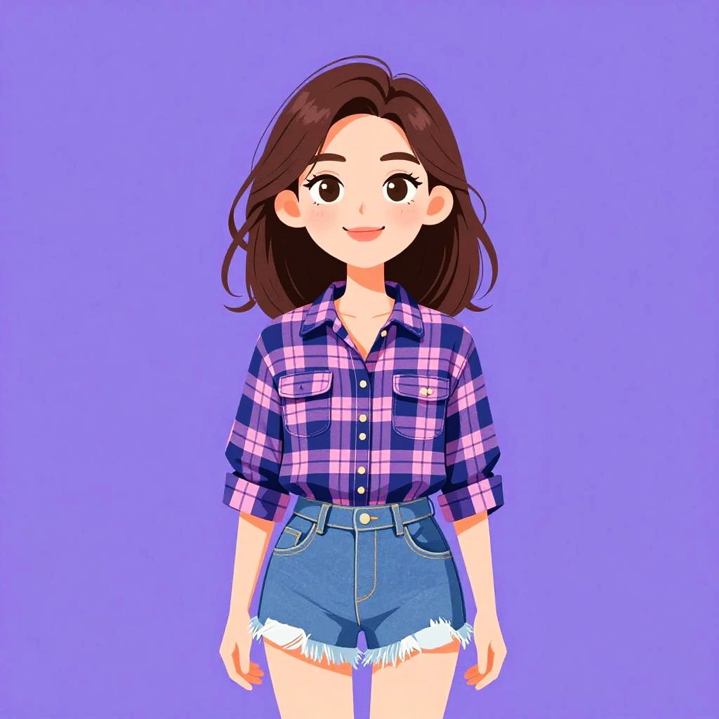 Woman with pretty face and pretty hair. Woman, casual, soft-textured yellow cardigan with oversized buttons, white collar detail, layered over a white tank top, green and white gingham pattern shorts, light makeup, relaxed hair, retail store background. --sref 1467