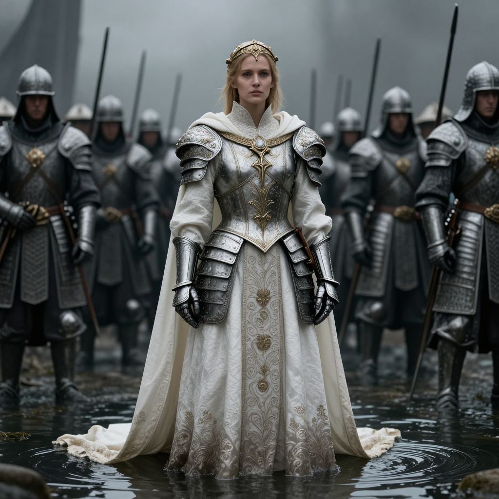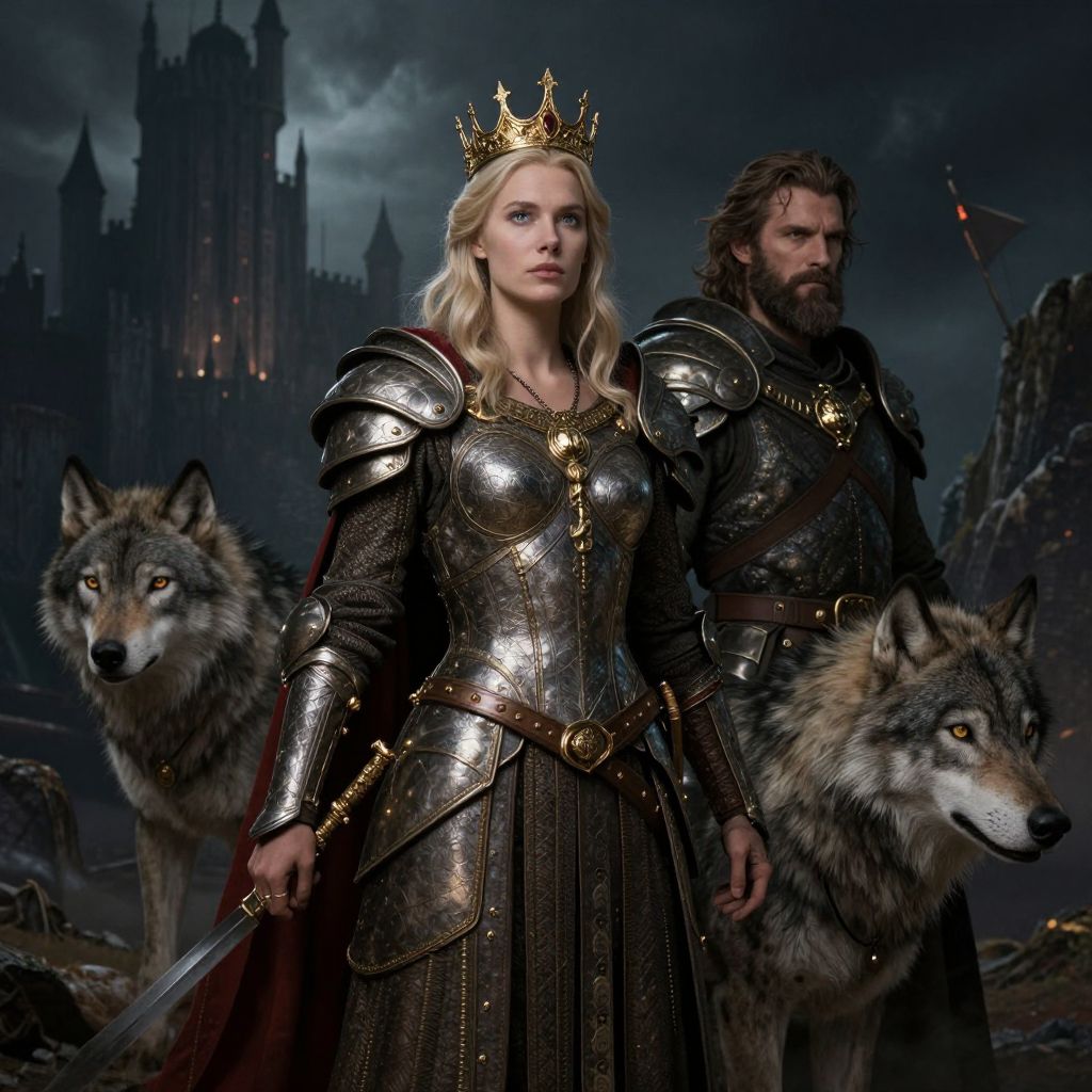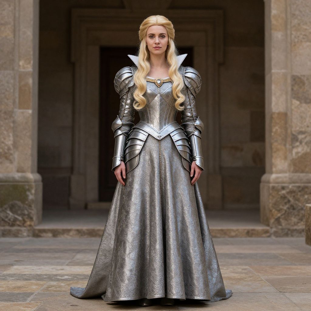 A majestic woman with long, flowing blonde hair adorned with golden strands, wearing a detailed medieval costume featuring a deep crimson and silver embroidered gown with a high collar and armored sleeves, stands confidently on a sun-drenched hilltop. She holds a polished steel spear in one hand and a large, ornate shield with a crest of a lion in the other. She wears black leather boots with intricate buckles and a golden belt engraved with ancient symbols. A royal crown made of silver and gemstones rests on her head, glinting in the sunlight, symbolizing her noble and powerful status. The background features a misty forest and a distant castle, adding a sense of grandeur and historical depth.