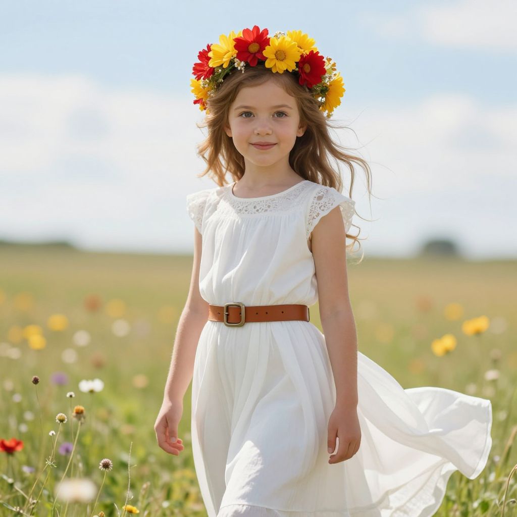 A beautiful young girl stands in a sunny meadow, dressed in a flowing white dress that gently billows in the breeze. She has a vibrant crown of red and yellow flowers arranged beautifully on her head, adding a cheerful and whimsical touch. A warm brown leather belt is tied snugly around her waist, enhancing her elegant and natural look. Her soft, golden-brown hair flows slightly behind her, and she has bright, curious eyes that seem to smile at the viewer. The background features a blooming field of wildflowers and a soft blue sky with scattered clouds, creating a dreamy, serene atmosphere.