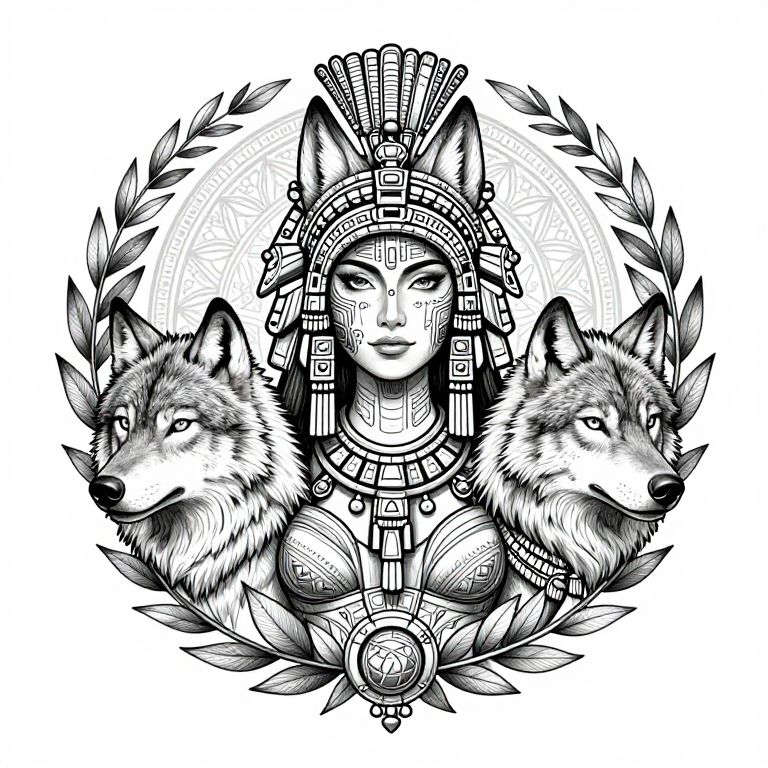 The image showcases a meticulously detailed line art tattoo design featuring a female Aztec warrior. She is adorned with a wolf headdress, intricately designed with geometric patterns and a mandala in the background. The warrior's face is adorned with elaborate facial tattoos, and she wears a necklace with pendant drops. Two wolves flank her, one on each side, their fur and facial expressions rendered with precision. The design is surrounded by a circular frame, filled with leafy elements, adding a naturalistic touch to the composition. The overall arrangement of the elements creates a harmonious balance, with the warrior at the center, the wolves framing her, and the mandala providing a spiritual backdrop. The use of black and white enhances the contrast and highlights the intricate details of the design.