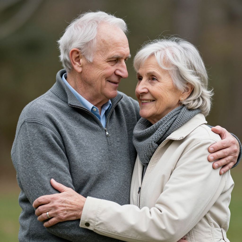 Two elderly individuals embrace warmly outdoors, with the man wearing a gray zip-up sweater over a light blue shirt and the woman donning a cream-colored jacket and a knitted gray scarf, both smiling affectionately against a blurred natural backdrop.
