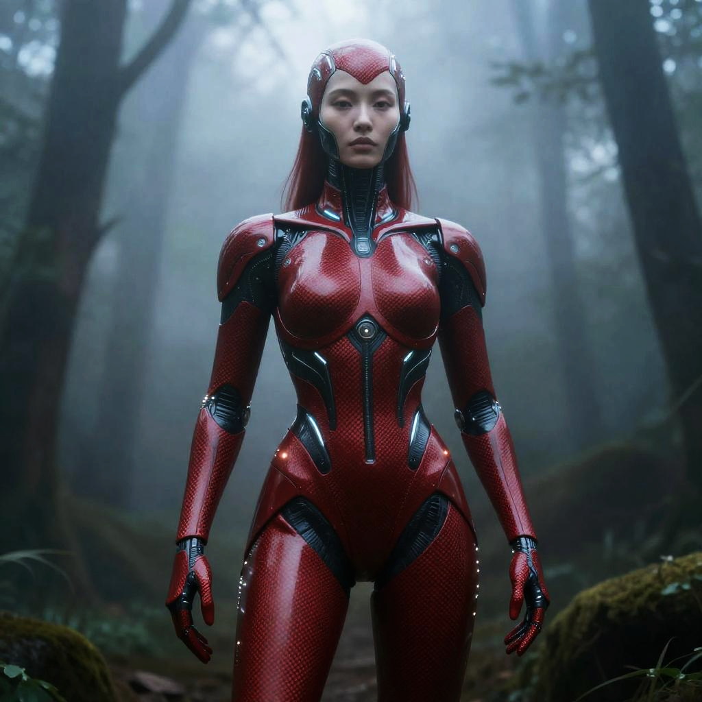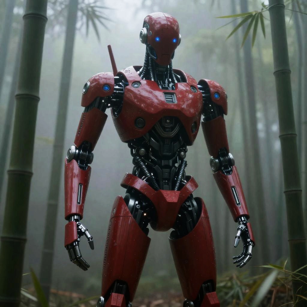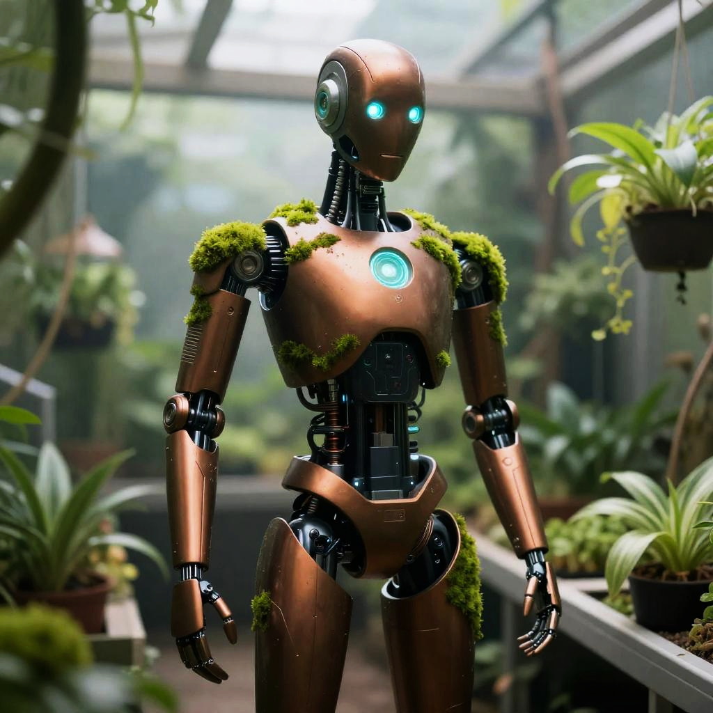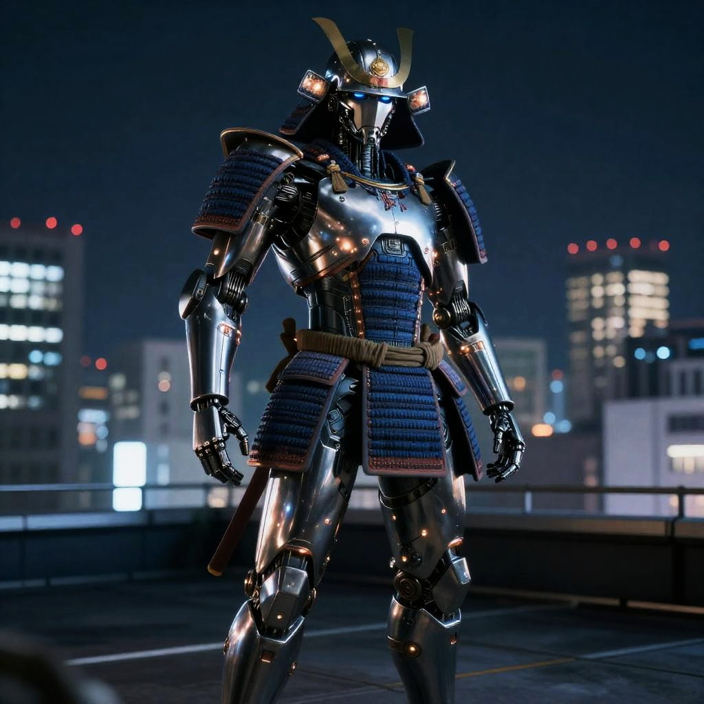 A highly advanced robot with shimmering black composite material stands in a floating space station. Its body is adorned with glowing accents that pulse softly. Captured in stunning 8k quality, the image showcases sharp details and a ghostly overlay that adds depth, merging technology and fine art in a captivating scene.