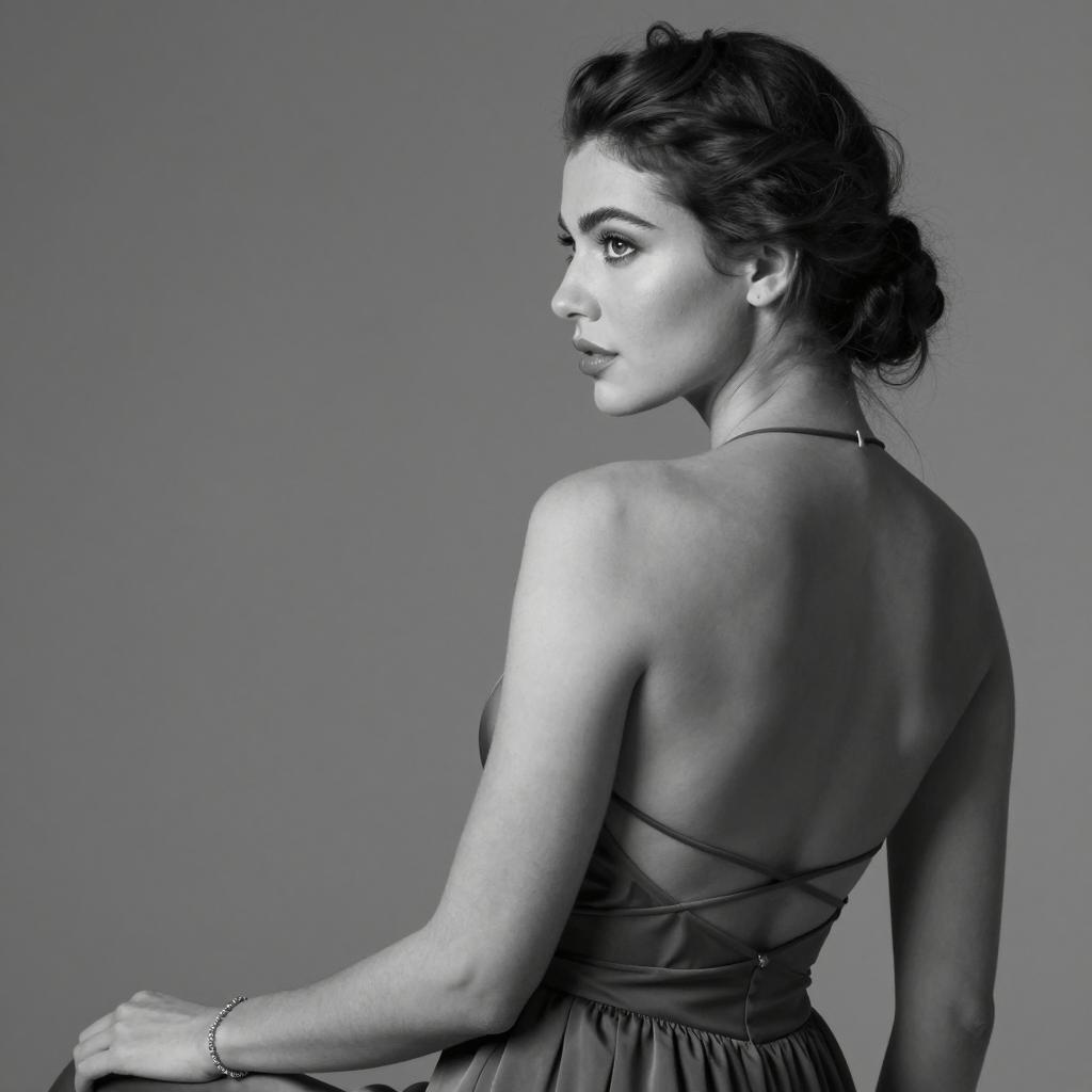 Black and white photo of a woman with light skin and short curly hair. She wears a shiny, dark hat with a feather and a black dress with silver chains draped over her chest. She stands against a plain white background, looking to the side with a neutral expression. She has a slender build and small breasts. Her right arm is slightly bent at the elbow.