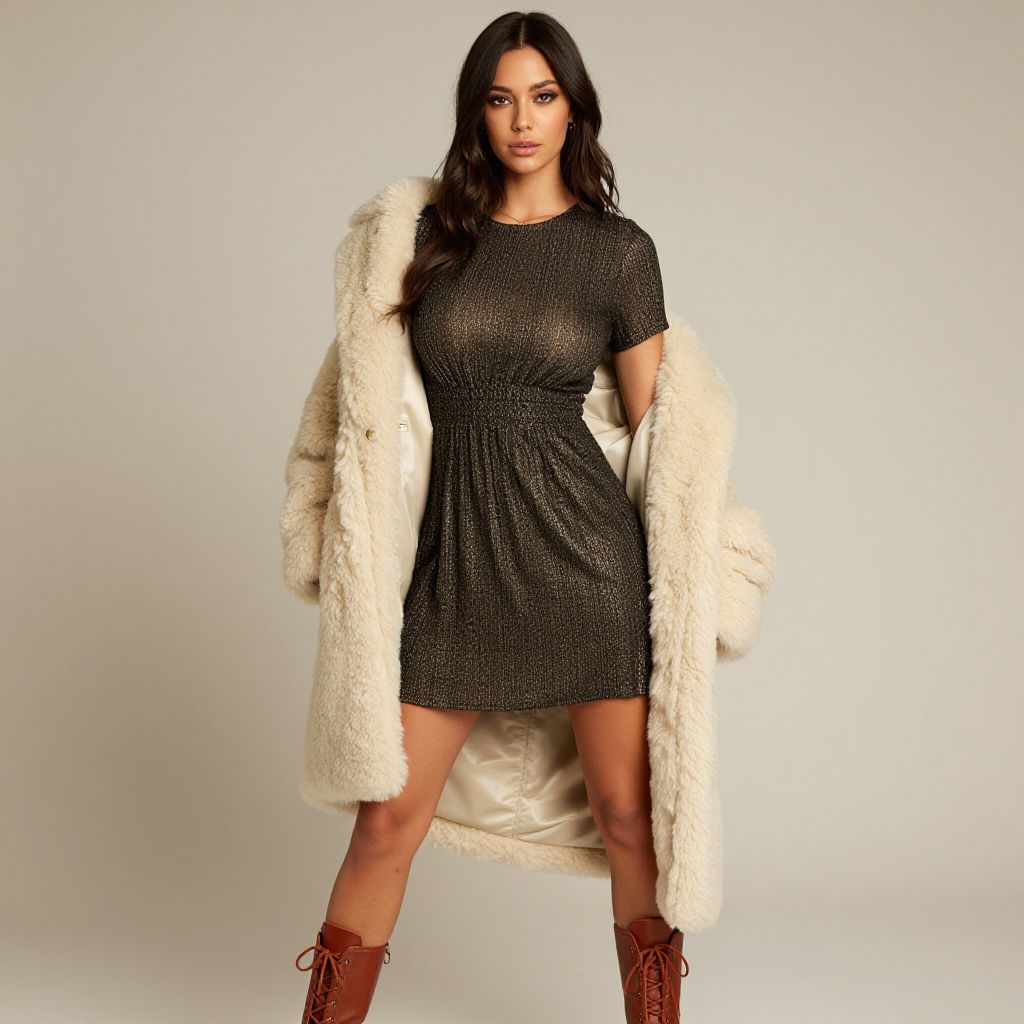 "Woman, contemporary with a vintage twist, metallic textured mini dress with gathered waist, crew neck, short sleeves, creamy shearling coat draped over shoulders, chestnut brown lace-up ankle boots, simple makeup, studio background.. Sexy. Pretty face and beаutiful eyes. Big breasts."