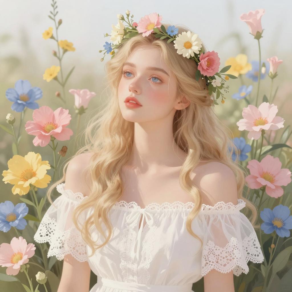 Digital illustration of a young woman with long, wavy blonde hair, wearing an off-shoulder white dress with floral patterns. She has fair skin, blue eyes, and a neutral expression. She is surrounded by yellow flowers in the background. Her hair is adorned with a flower crown. The background is a soft, greenish hue. She is positioned slightly to the right, with her head turned towards the viewer. The image uses a realistic, detailed style.