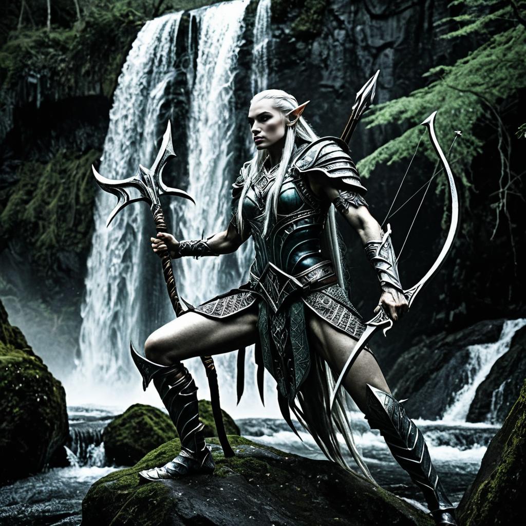 Illustration by Luis Royo depicting a valiant elven archer, her figure illuminated by the soft glow of a bow engraved with silver runes. She stands amidst a twilight forest shrouded in mist, as fiery embers drift through the air. The scene is drenched in shadow and light, capturing a moment of triumph and sorrow, with a sense of looming danger and epic resolve.