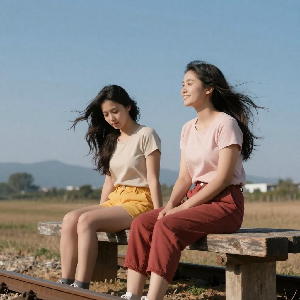 A group of three young Asian women standing outdoors in casual summer outfits, smiling and facing each other. They are wearing white tops and denim jeans, with minimal gold jewelry. The photo is captured in warm natural light, emphasizing a joyful and relaxed moment among friends.