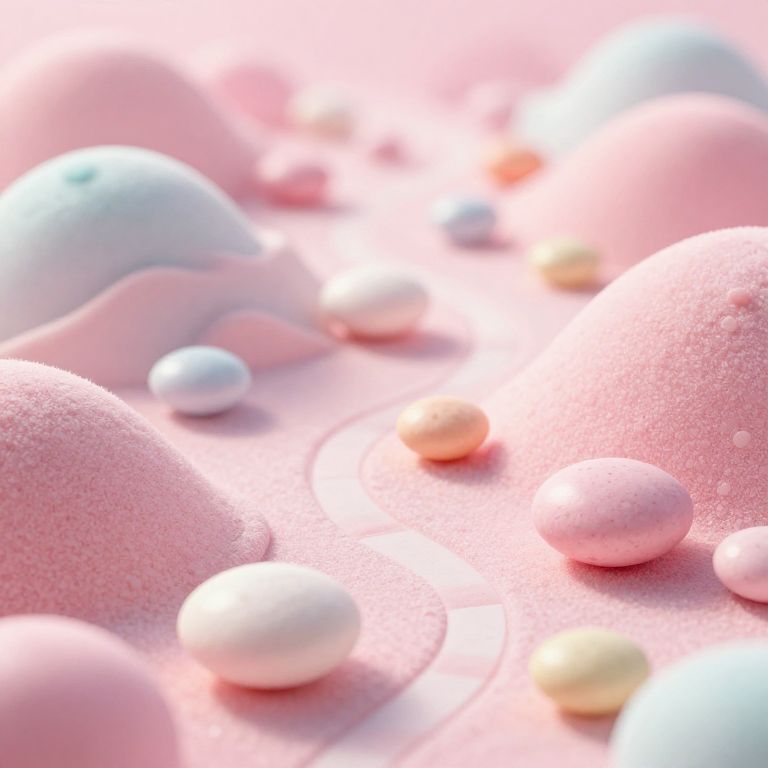 A dreamy pastel-colored landscape made of giant Mentos candies forming hills and pathways, whimsical and surreal atmosphere, soft focus with delicate lighting, combining fantasy and sweetness in a candy world concept art style.