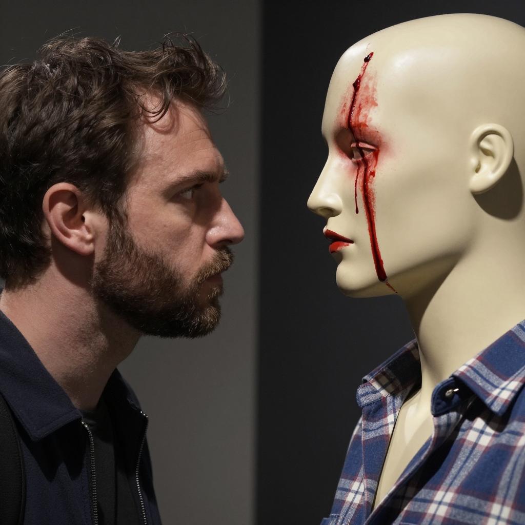 Photograph of a man with a short beard and dark hair, gazing intensely at a mannequin with a painted, blood-like design on its face and neck. The mannequin wears a blue plaid shirt. Mannequin's head is slightly tilted, face close to man's. Background is dark and indistinct. Man on left, mannequin on right.