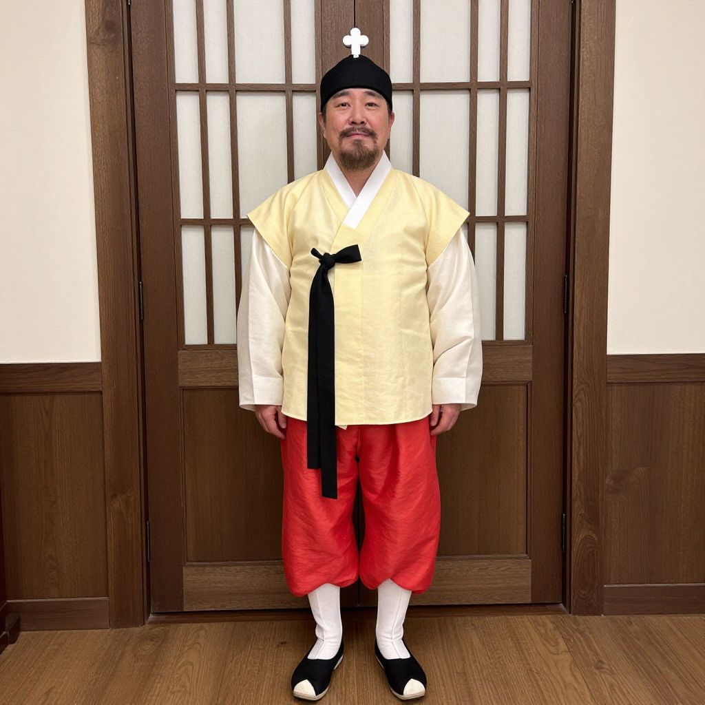 Old disney costume, 1boy, solo, male focus, hat, indoors, standing, full body, facial hair, korean clothes, mustache, long sleeves, old man