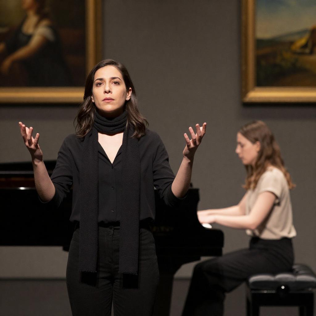 Photograph of two women on a dimly lit stage. Foreground woman with dark hair, black blouse, and black scarf, hands raised. Background woman with light hair, beige top, seated at piano. Piano in center, blurred paintings on walls.