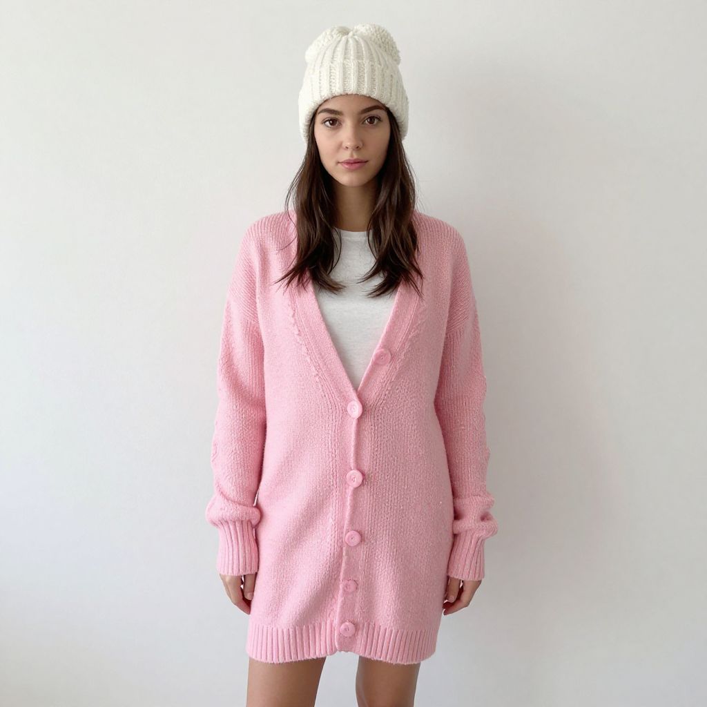 Pink Christmas Cardigan Costume, dressed in a pink coat and hat standing in front of a white wall