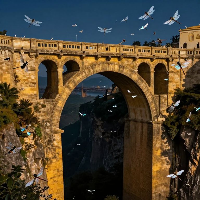 Spanning majestically across a deep canyon, a golden stone arch bridge is adorned with countless dragonflies whose shimmering wings cast soft trails of phosphorescent light, creating a mesmerizing spectacle as they flutter above and through the structure.