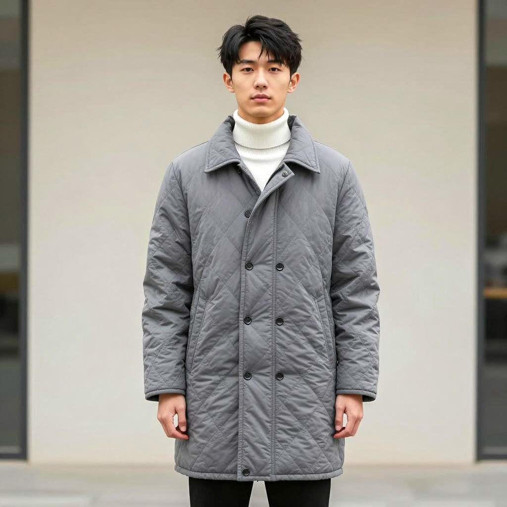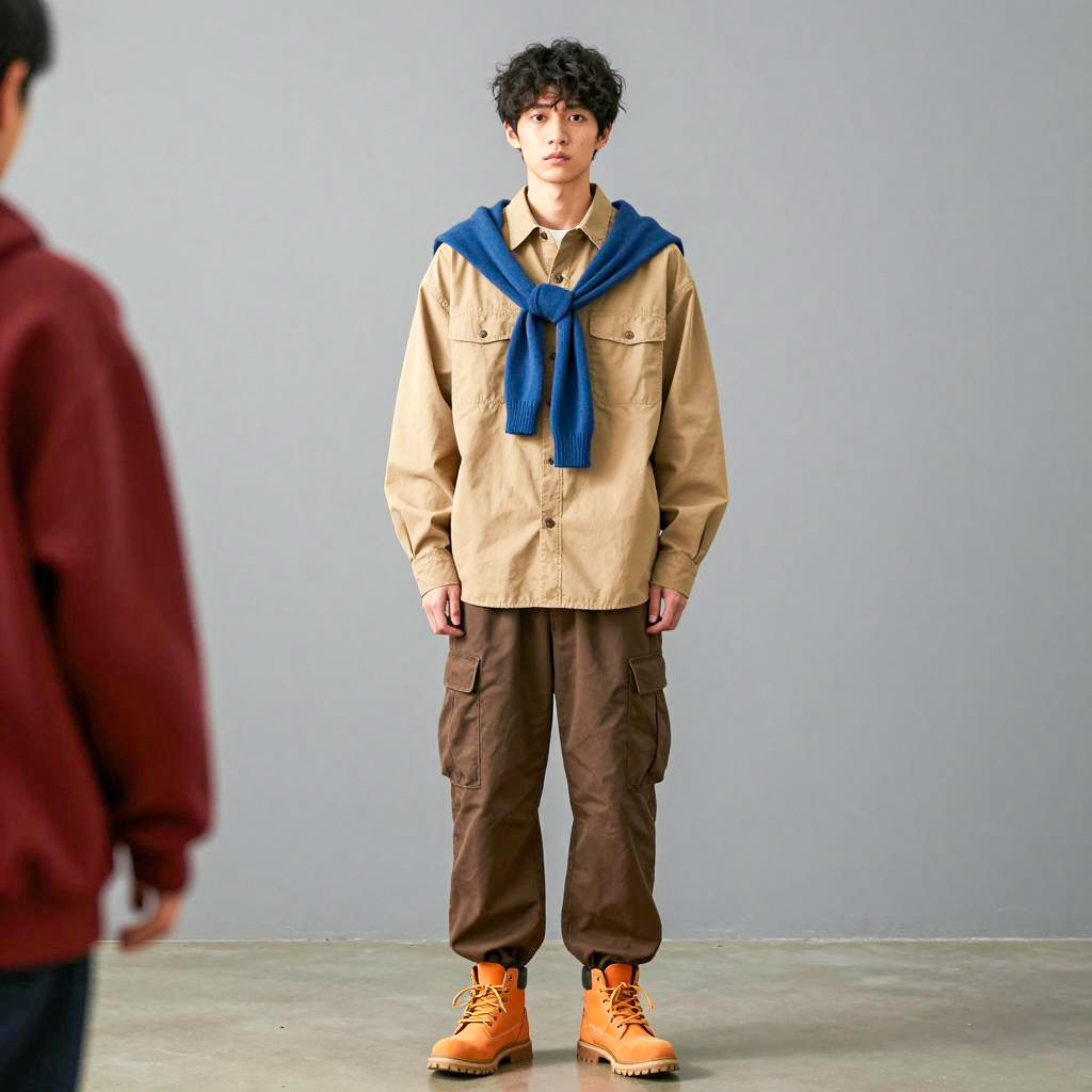 Photorealistic image of a young Asian man with short brown hair standing in an urban alley during daytime. He wears a white long-sleeve shirt, brown cargo shorts, white socks, and green and brown boots. The background shows blurred pedestrians and buildings, capturing a casual street style with natural bright lighting.