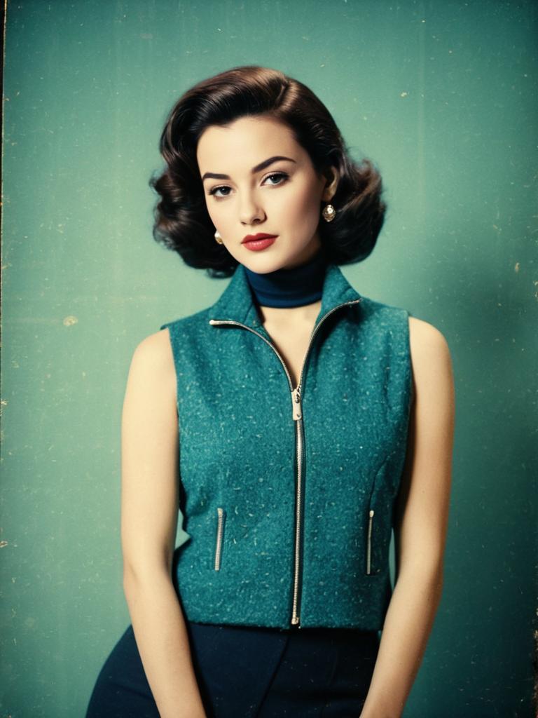 Woman, casual, navy quilted vest with a high collar, zipper front, grey ribbed turtleneck sweater, black leggings with zipper accents at the hips, no visible footwear. --sref 1387