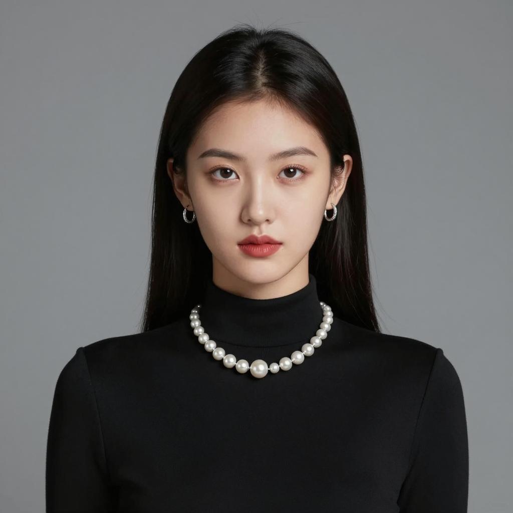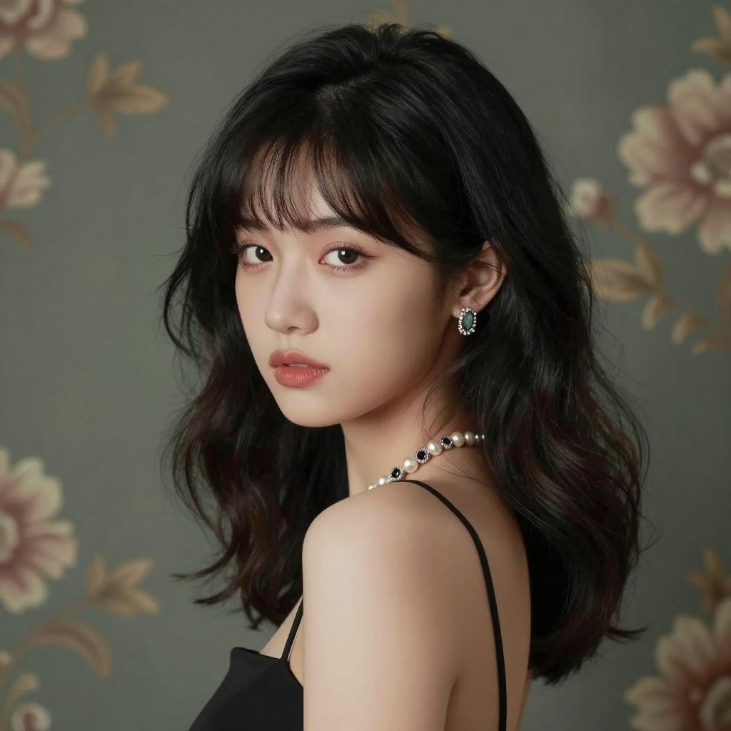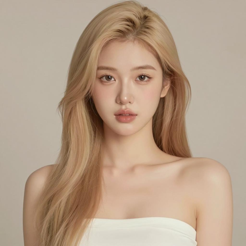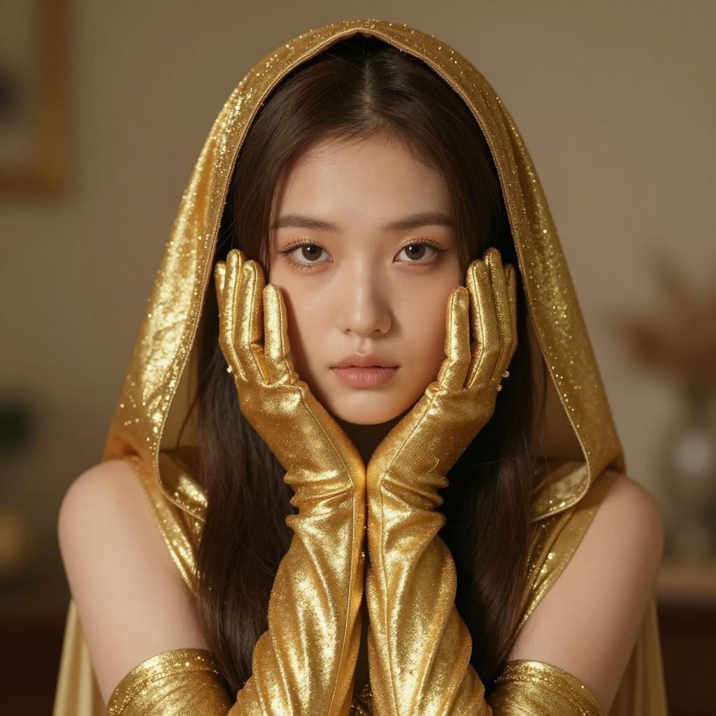 Photo-realistic portrait of a young Asian woman with long dark hair and fair skin, wearing a glittery gold hooded robe and matching gold gloves. She is posing with her hands framing her face against a neutral blurred background, with soft lighting highlighting the detailed texture of the gold fabric. The image features a calm expression, realistic makeup, and a warm golden color palette, conveying an elegant and mysterious vibe.