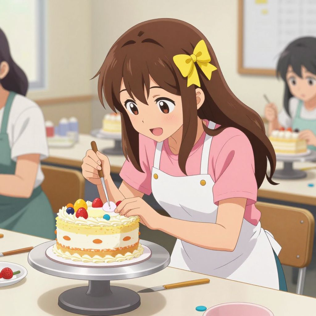A vibrant anime-style illustration depicts a cheerful young woman with long brown hair adorned with a yellow bow, wearing a pink shirt and white apron as she meticulously decorates a layered cake with colorful frosting and toppings during a cake decorating class, showcasing detailed digital artistry and a bright, inviting atmosphere.