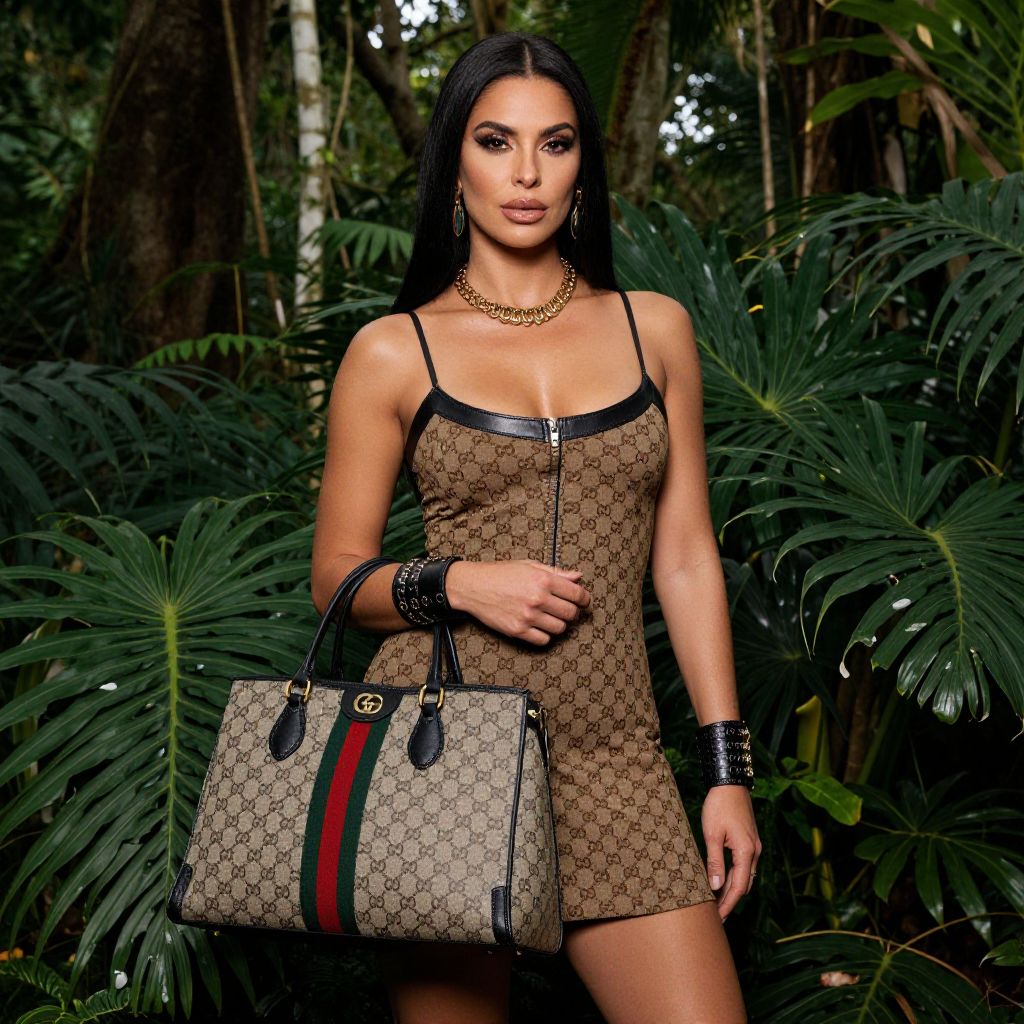 Photograph of a striking woman with long black hair and olive skin standing in a lush, green jungle. She's wearing a brown, Gucci-patterned dress with leather accents, a gold necklace, and matching earrings. Her arms are adorned with black leather cuffs, and she holds a large, brown Gucci handbag with red and green stripes. The background is dense with tropical foliage.