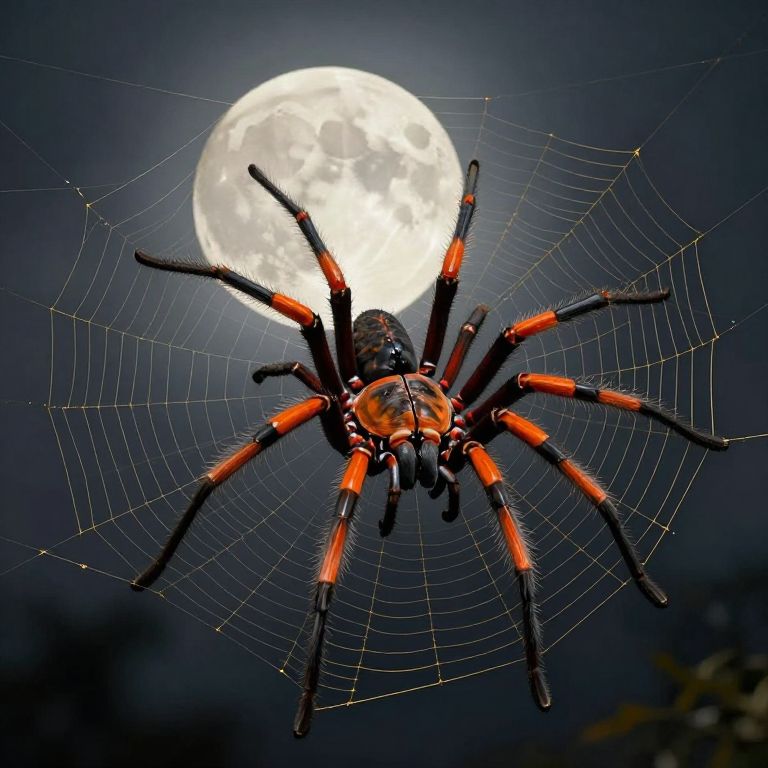 Giant arachnid with vibrant orange and black patterns spins intricate webs of golden silk beneath a luminous full moon, its eight legs suspended gracefully against a dark, misty backdrop.
