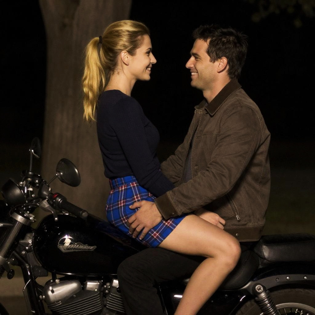Man in beige suit, red shirt, brown hair, medium build, grabs blonde woman in white satin dress, long hair, light skin, from behind. Bedroom with red lamps, framed pictures, and patterned bedspread. Man's expression intense, woman's surprised. Both on bed. Two red lamps in background. Warm lighting.