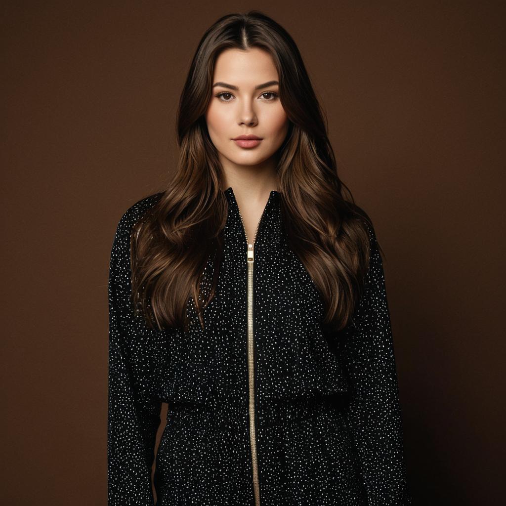 Full-body portrait of a young woman with long brown hair wearing a black polka dot casual party suit dress and black high heels, standing against a grey studio background.